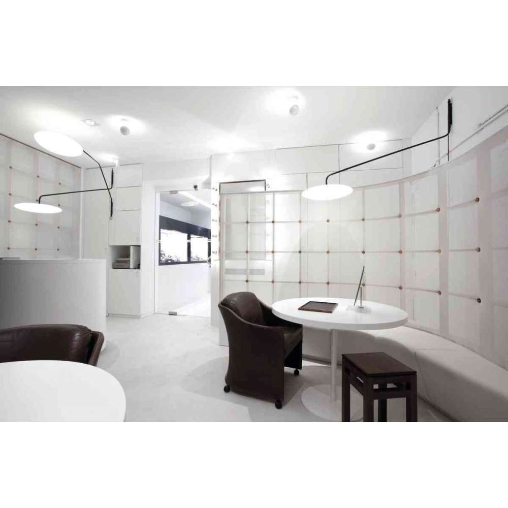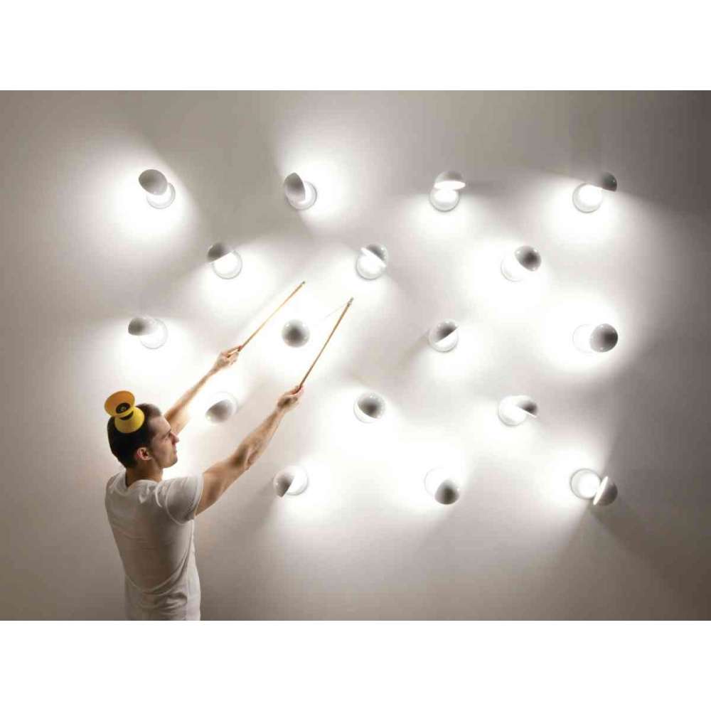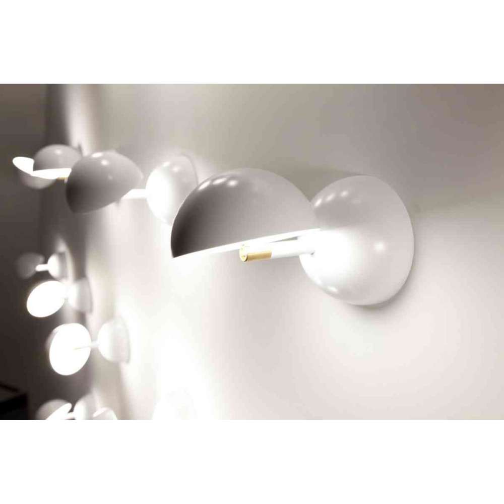 Dwie półkule, para lub bliźniaki, z których jeden jest oświetlony diodami LED i obraca się o 190° / 360° wokół własnej osi. Pojedynczy lub w linii, przywołuje obrazy zaćmienia słońca, fotela chesterfield lub zabawki diabolo. Dostępna jako lampa stołowa, kinkiet lub lampa sufitowa oraz w kilku kolorach.
