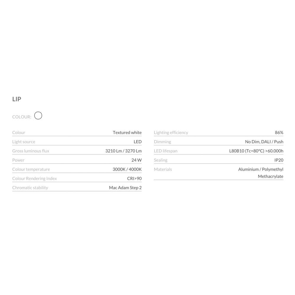 Poprzez kompaktowe rozmiary wyróżnia się owalną geometrią i możliwością integracji ze ścianą za pomocą ukośnego połączenia, które nadaje tej oprawie szczególną prezencję i zróżnicowaną estetykę. Formalnie Lip prezentuje się jako element ścięty od płaszczyzny pionowej, skąd w idealnie jednorodny sposób emituje światło oblewające ścianę.