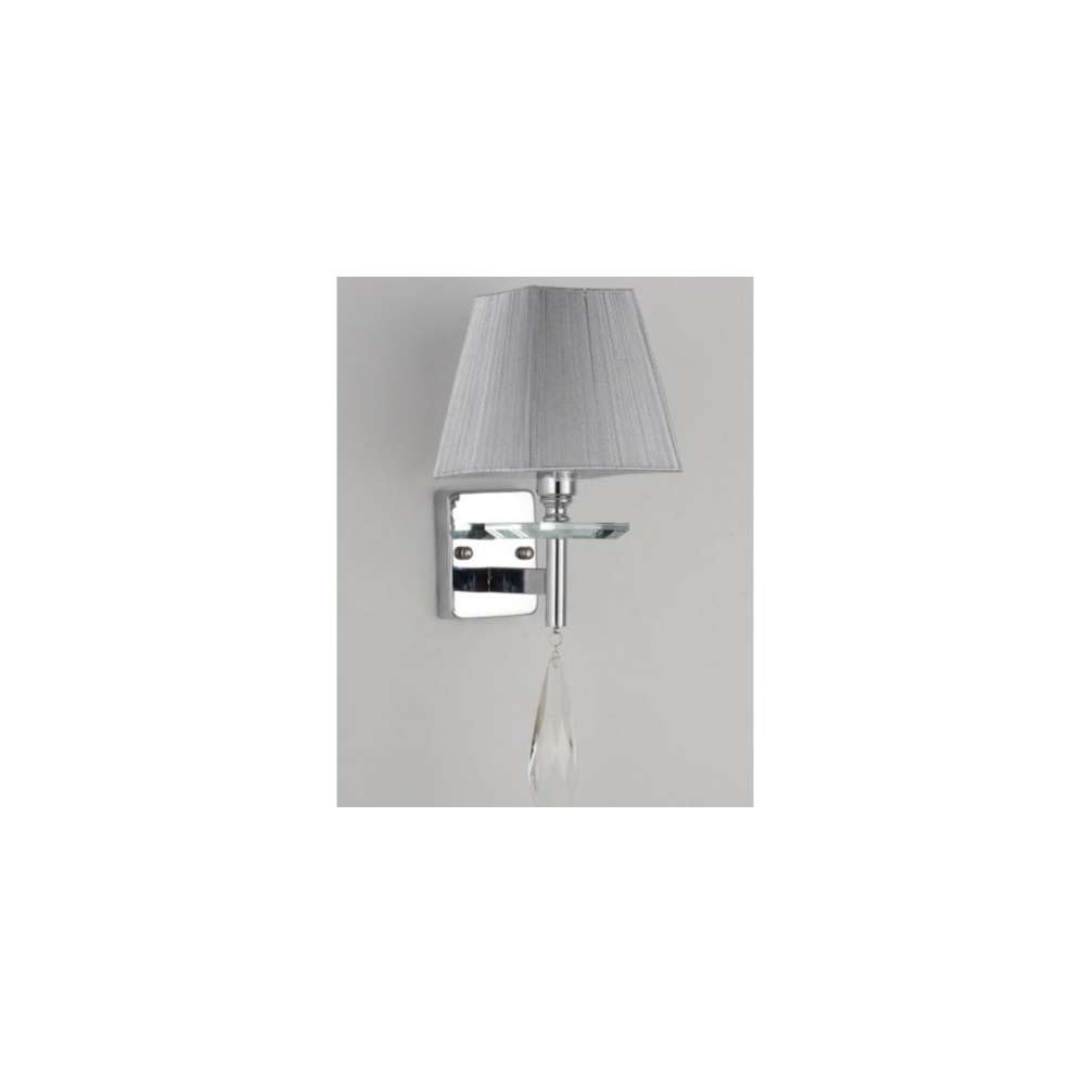 Valentina to kinkiet z chromowanego metalu, kryształów i klosza z ognioodpornej tkaniny. Lampa dostępna z tkaniną w kolorze szarym lub kremowym. Posiada punkt świetlny z gniazdem E14, napięcie 220-240 V, moc 40W. Nadaje się do wszystkich rodzajów żarówek, brak w zestawie.