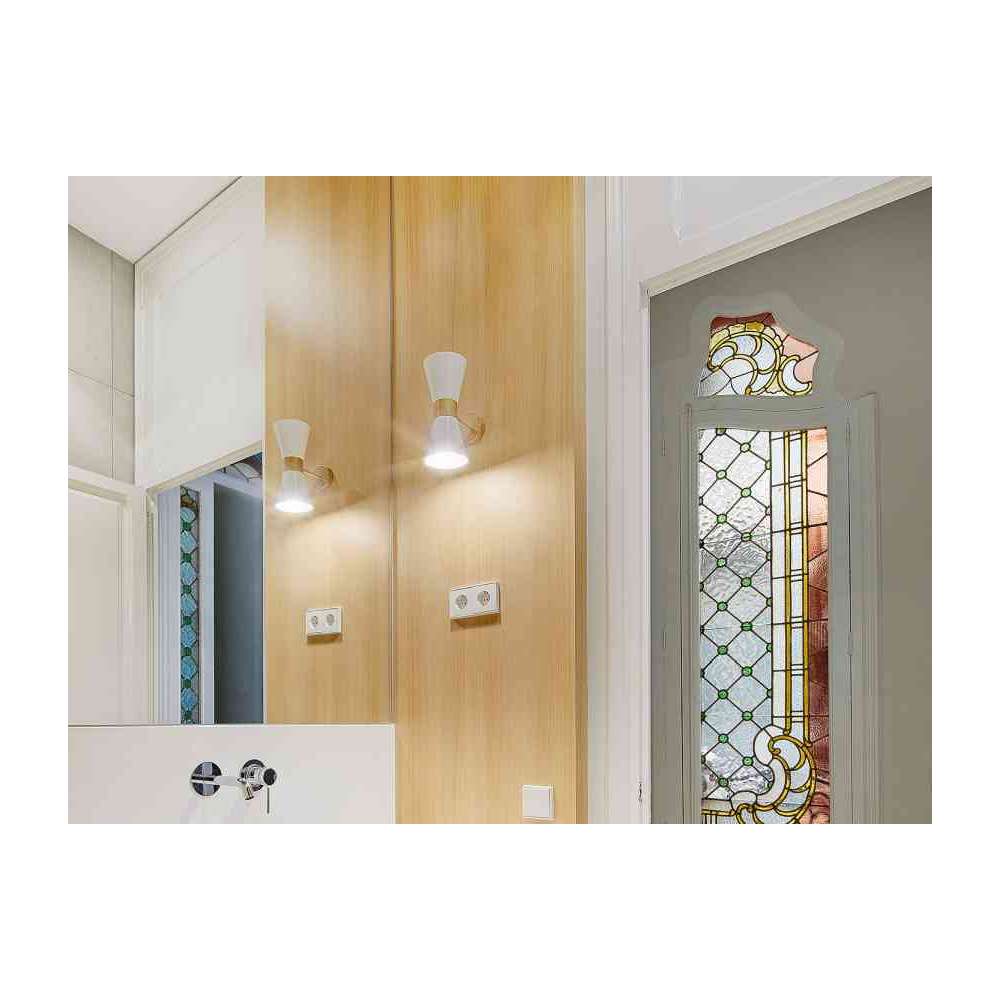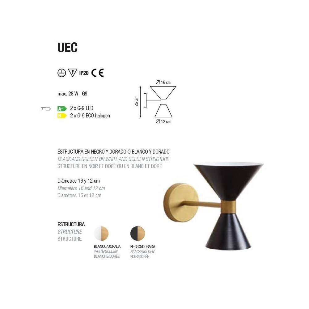 Lampa ścienna Uec jest dostępna w kolorze czarnym i złotym, a jej podwójne metalowe klosze wyświetlające światło w górę i w dół sprawiają, że jest to bardzo dekoracyjna lampa odpowiednia zarówno do użytku domowego, jak i do projektów kontraktowych. Materiały i wykończenia Czarno-złota lub biało-złota struktura. Charakterystyka elektryczna 2 x żarówki G-9 LED 8W (bez żarówek)Odbiorca: :