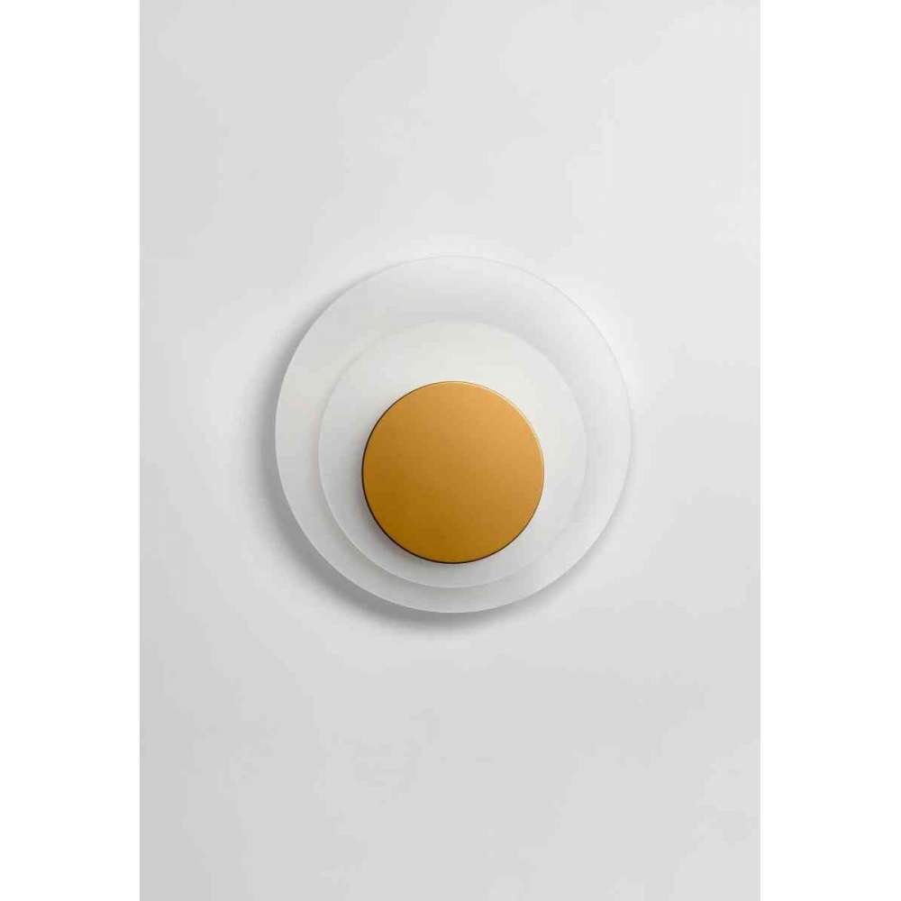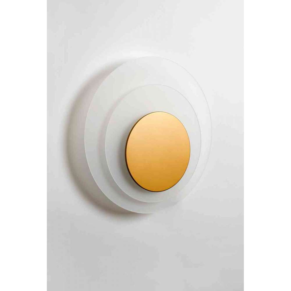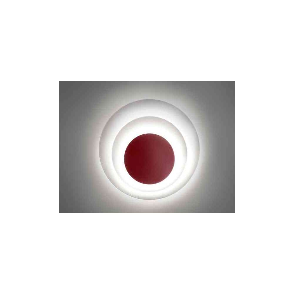 Lampa ścienna z dwoma asymetrycznymi kloszami rozpraszającymi z przezroczystego polimetakrylanu metylu ( PMMA) z satynowym wykończeniem po obu stronach, termoformowane do grubości 3 mm, z trzecim odcieniem z tłoczonej stali z wykończeniem antracytowym, bordowym lub złotym lakierem. Podstawa oprawy sufitowej ze stali tłoczonej w białym lakierze z wewnętrznym cylindrem do umieszczenia elastycznej taśmy LED, aby zapewnić równomierne światło na całej powierzchni.