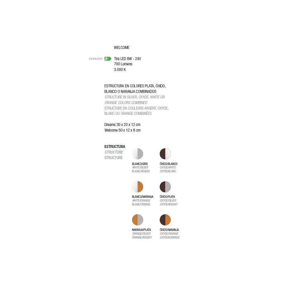 Ta lampa ścienna Welcome wprowadzi ciepłe światło do sypialni dzięki mocnemu źródłu led, jest również bardzo funkcjonalną lampą, ponieważ jej powierzchnia służy jako półka na różne przedmioty. Materiały i wykończenia Konstrukcja w połączeniu kolorów srebrnym, tlenkowym lub białym. Właściwości elektryczne LED 8W 700 lm 3000 KOdbiorca: :