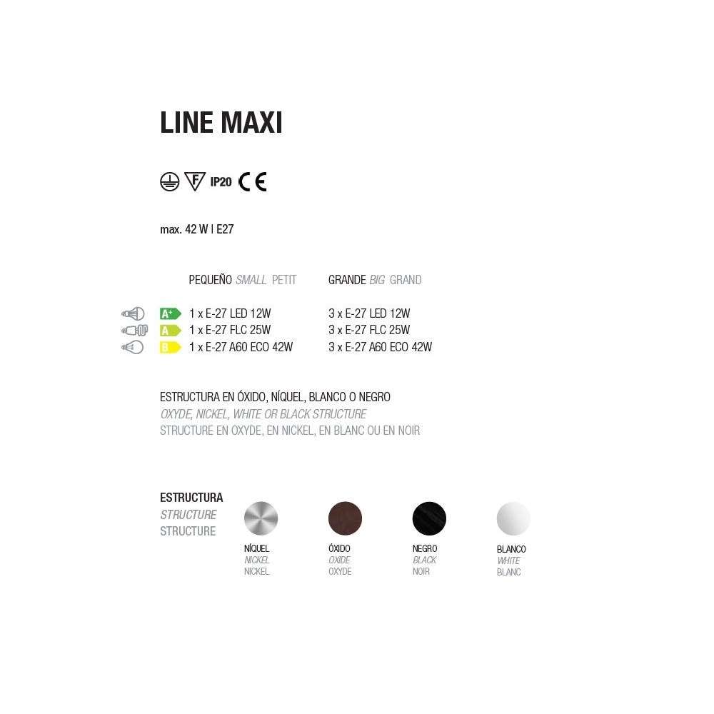 Kinkiet Line dostępny jest w dwóch rozmiarach i różnych wykończeniach. Wszystkie wersje posiadają oświetlenie górne i dolne. Jest to bardzo wszechstronna lampa, która nadaje się zarówno do użytku domowego, jak i projektów kontraktowych. Materiały i wykończenia Struktura z niklu, białego lub czarnego i przezroczystego szkła. Charakterystyka elektryczna Linia 30 cm 1 żarówka E-27 LED 12W Linia 80 cm 3 żarówki E-27 LED 12W (żarówki nie są dołączone)Odbiorca: :