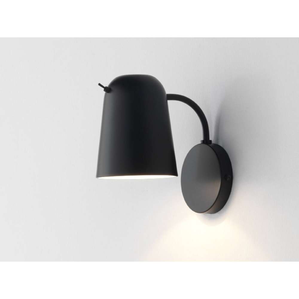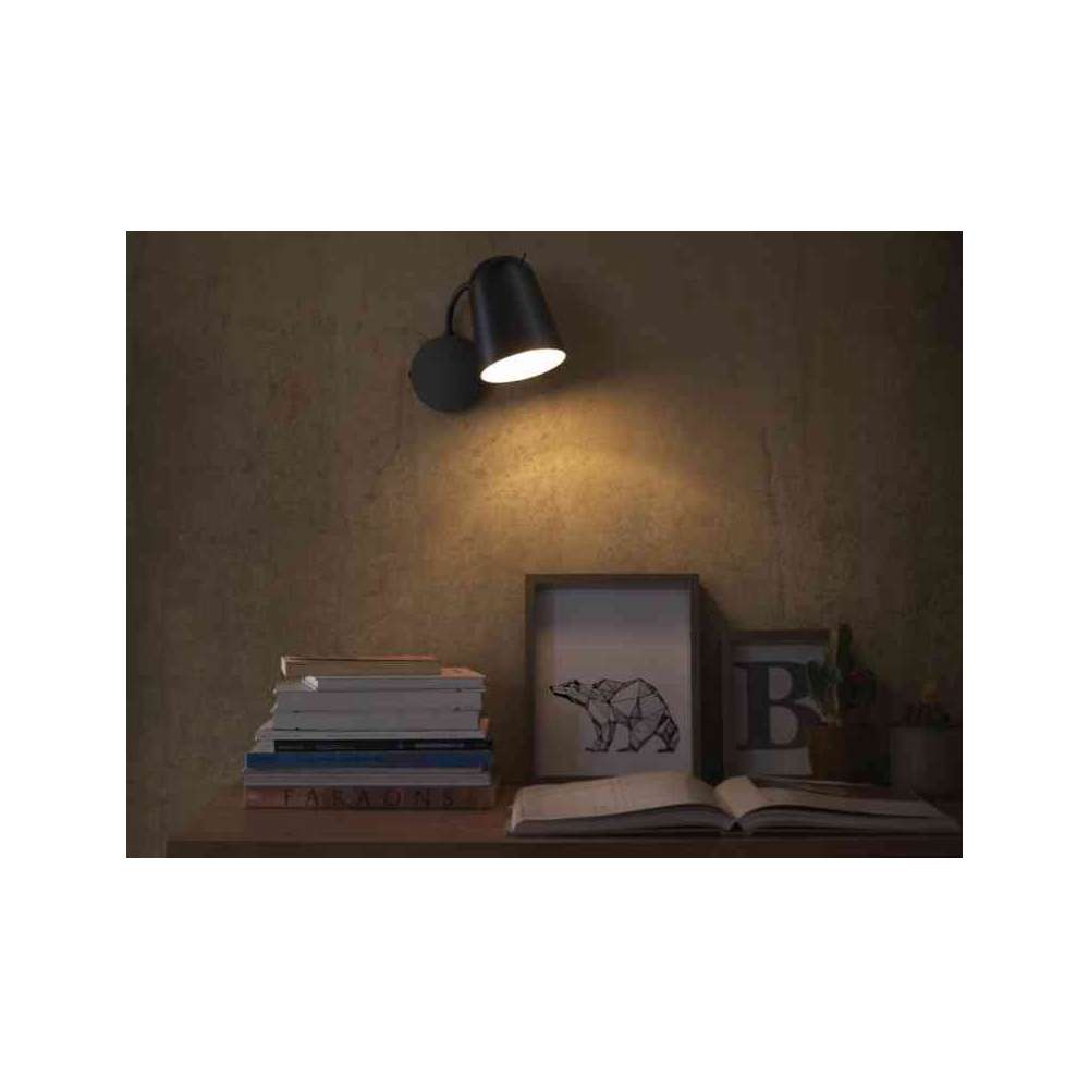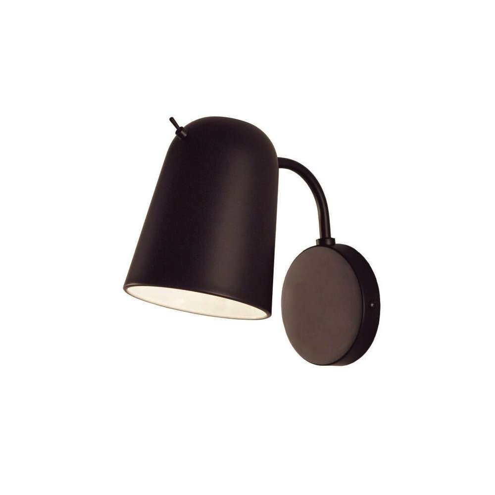 Metalowy kinkiet z matowym czarnym wykończeniem. Wahadłowy klosz z włącznikiem. Oprawka E14. Żarówka nie jest dołączona.