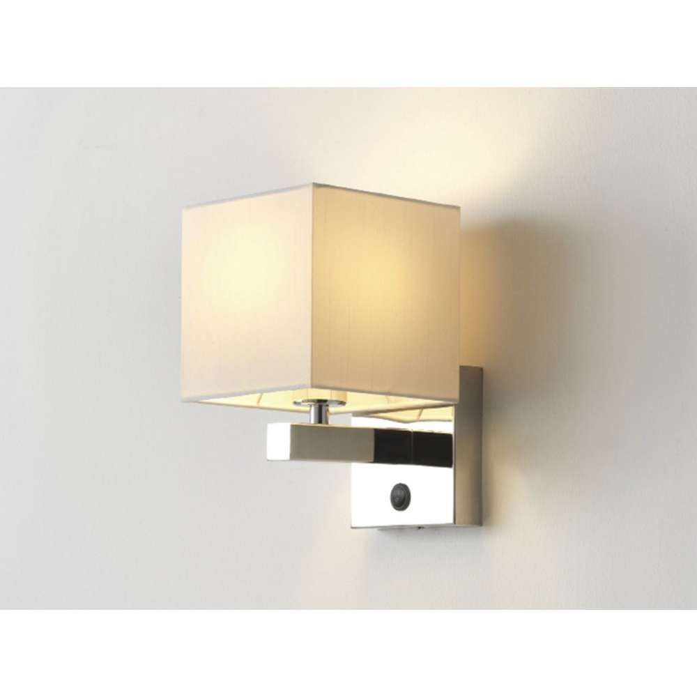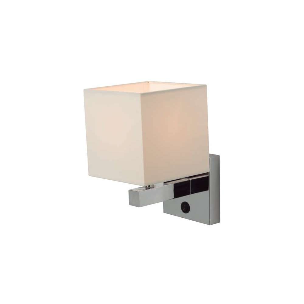 Metalowa lampa ścienna. Chromowane wykończenie. Włącznik na tylnej płycie. Klosz z białej tkaniny. Oprawka E27, bez żarówki.