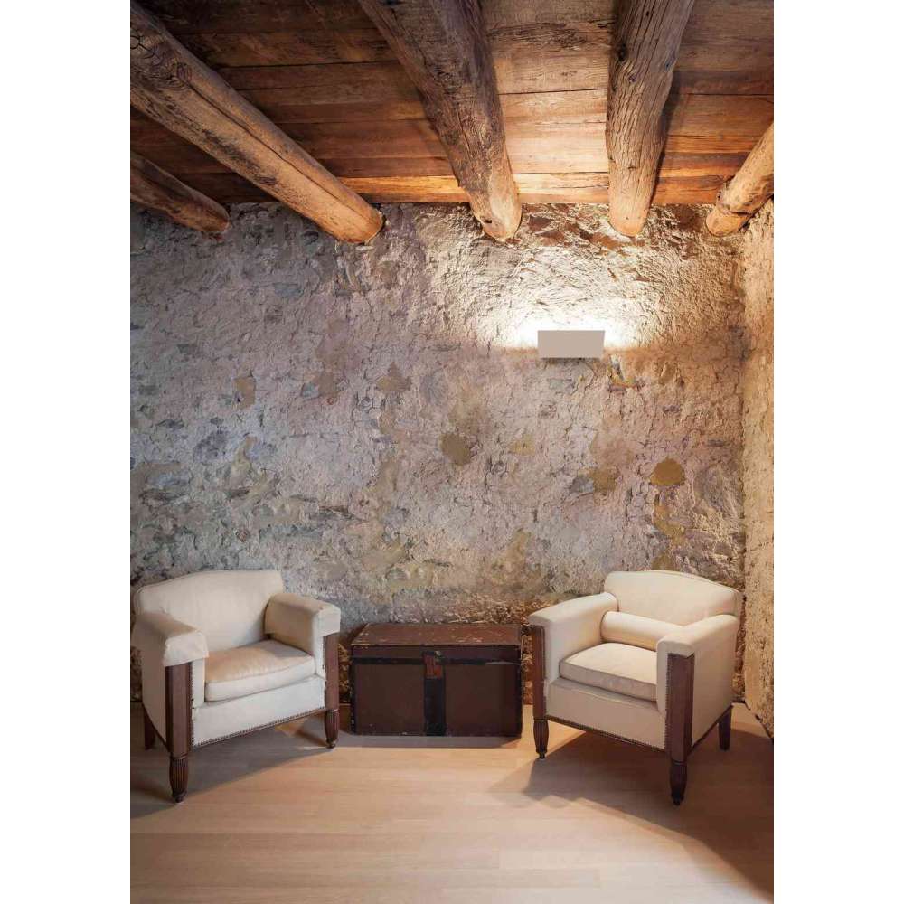 Oprawa naścienna LED. Standardowy całkowity strumień świetlny 1290 lub 2580 lm, 4000K, CRI>80 i żywotność 50.000h (@L80, B10, Ta 25ºC). Przezroczysty klosz z poliwęglanu zapewnia równomierne oświetlenie ściany dzięki równomiernemu pośredniemu rozsyłu światła. Opcjonalny sterownik ściemniania DALI i 3000K.