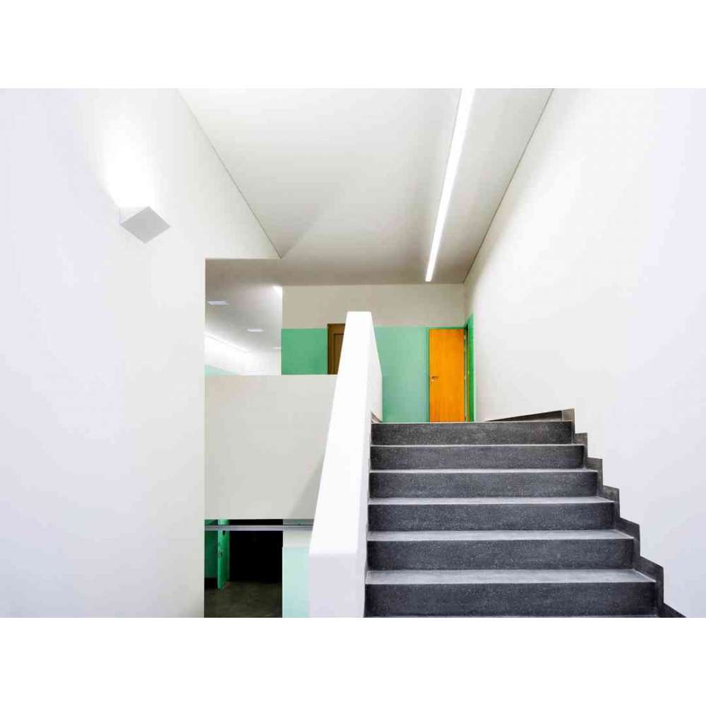 Oprawa naścienna LED. Standardowy całkowity strumień świetlny 2580 lub 5160 lm, 4000K, CRI>80 i żywotność 50.000h (@L80, B10, Ta 25ºC). Opalowy klosz z poliwęglanu do równomiernego oświetlenia ściany dzięki równomiernemu pośredniemu rozsyłu światła. Opcjonalny sterownik ściemniania DALI i 3000K.