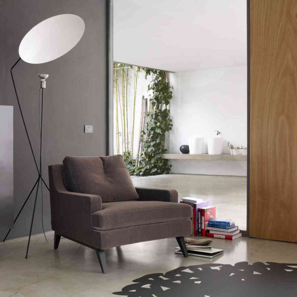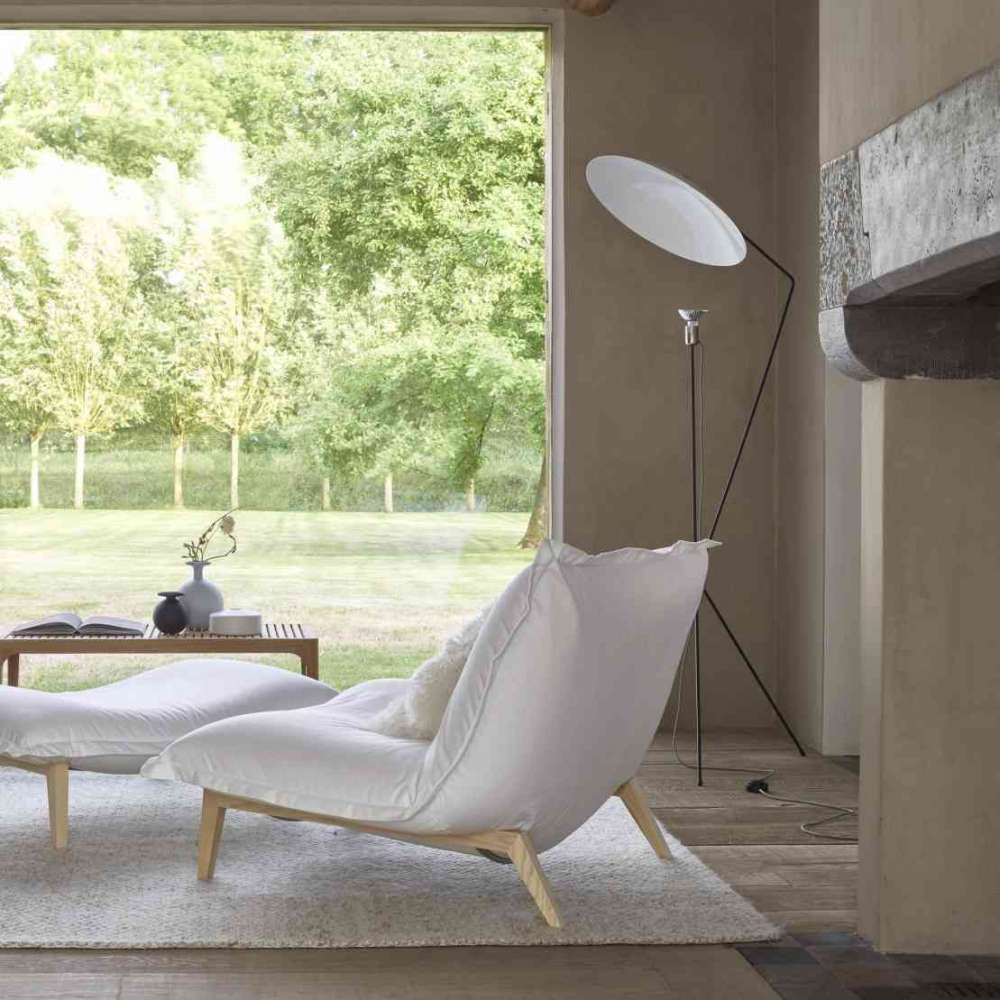 Lampa podłogowa z odbłyśnikiem z blachy stalowej z repusowanego lakieru w kolorze białym. Klosz połączony jest z podstawą za pomocą magnesu, co umożliwia zmianę kąta ustawienia odbłyśnika. Solidna podstawa rurowa (Ø 10 mm) z lakierowanej na czarno stali z czarnymi plastikowymi ślizgaczami; matowa niklowana osłona oprawy oświetleniowej; szary kabel tekstylny; czarny przełącznik nożny. Dostarczana z 1 x 10W żarówką LED R30 3000K (ciepła biel), kąt rozproszenia 40°.