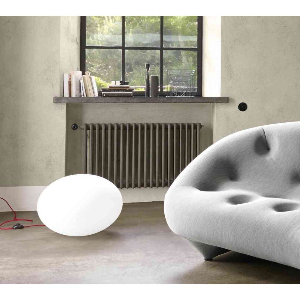 Światło z teksturowanego białego polietylenu formowanego rotacyjnie (PE) z czerwonym kablem tekstylnym (2 m) i czarnym włącznikiem nożnym. W komplecie 1 x 24 WE 27 kompaktowa spiralna żarówka fluorescencyjna, kolor 827 (ciepła biel).