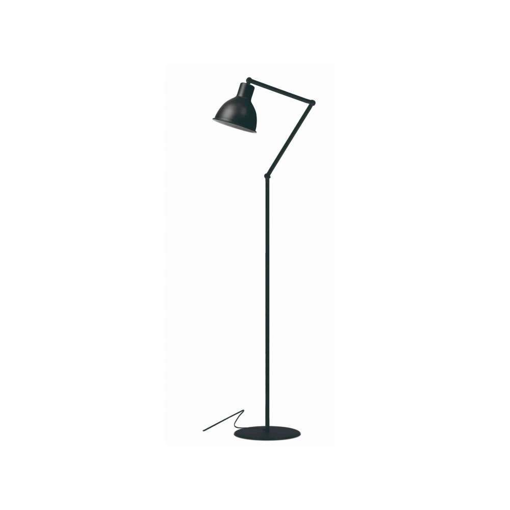 Lampa podłogowa w czarnej strukturze, średnica klosza 16 cm, długość pierwszego ramienia 25 cm i długość drugiego ramienia 30 cm, regulowana wysokość minimum 125 cm, czarny kabel z włącznikiem/wyłącznikiem