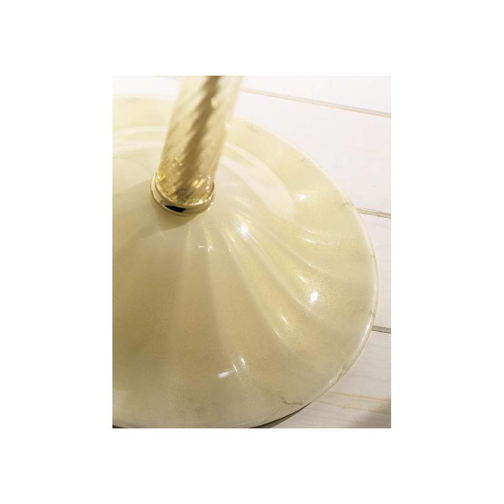 Szkło 'rigadin' z tradycji weneckiej w kolorze jedwabiu i z płatkami 24-karatowego złota jest wspólna cecha tej obszernej kolekcji lamp wiszących, sufitowych, kinkietów, lamp stołowych i podłogowych.