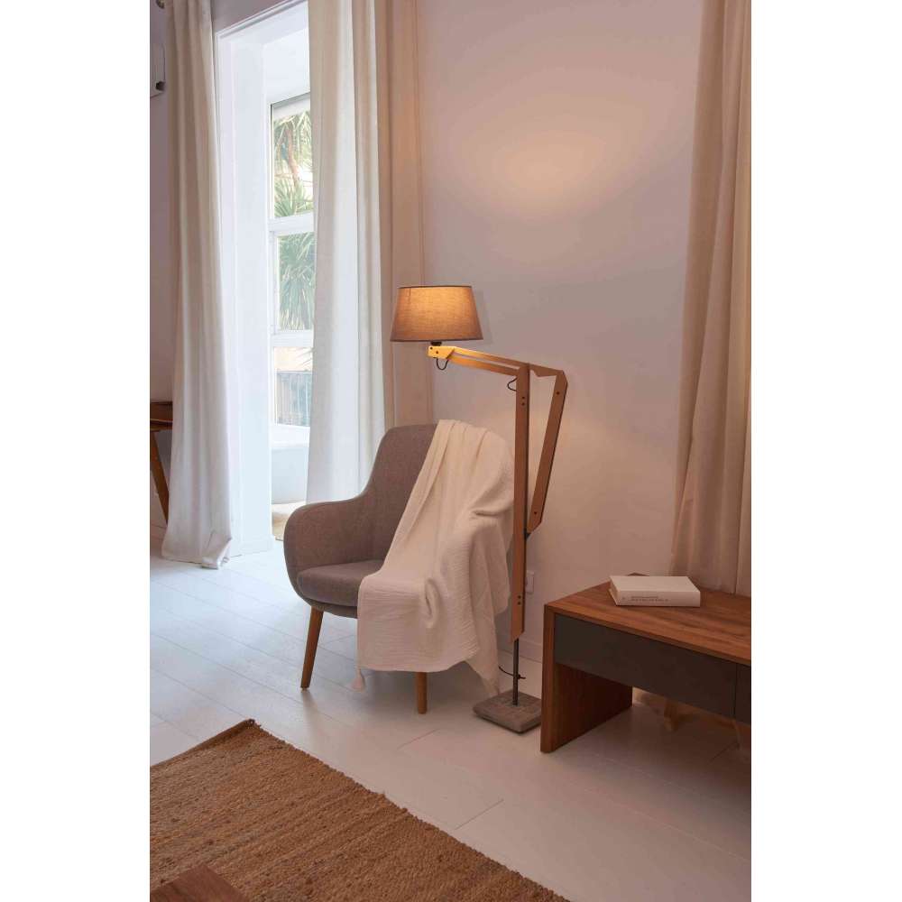 Lampa Thea to lampa podłogowa z ramieniem wychylnym o regulowanej wysokości dzięki systemowi przeciwwagi za pomocą mechanizmu ciernego. Jest to lampa o doskonałej równowadze estetycznej między zrównoważonymi materiałami a dynamiczną geometrią. Konstrukcja i podstawa wykonane są z drewna, cementu i żelaza. Drewno w konstrukcji zapewnia ciepło, a podstawą podłogi jest „panot Barcelona”, który jest symbolem tożsamości Barcelony, w której zaprojektowano i wyprodukowano tę lampę. Podstawa nadaje lampie zarówno wagę, jak i stabilność. Lampa podłogowa z konstrukcją z żelaza i naturalnego drewna bukowego, podstawa z modernistyczną hydrauliczną płytką cementową „panot”, klosz w kolorze szarym cotonet. 1 x E-27 (bez żarówki), IP20, czarny kabel z włącznikiem/wyłącznikiemOdbiorca: :