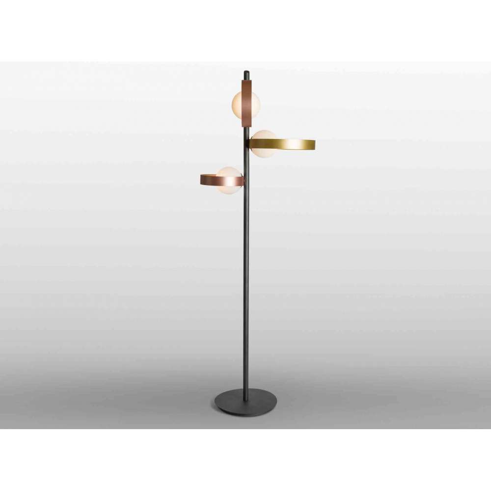 Bubble Lampa podłogowa ma grafitową ramę. Średnio szkliwione złote pierścionki i mały pierścionek z różowego złota, złota lub grafitu.