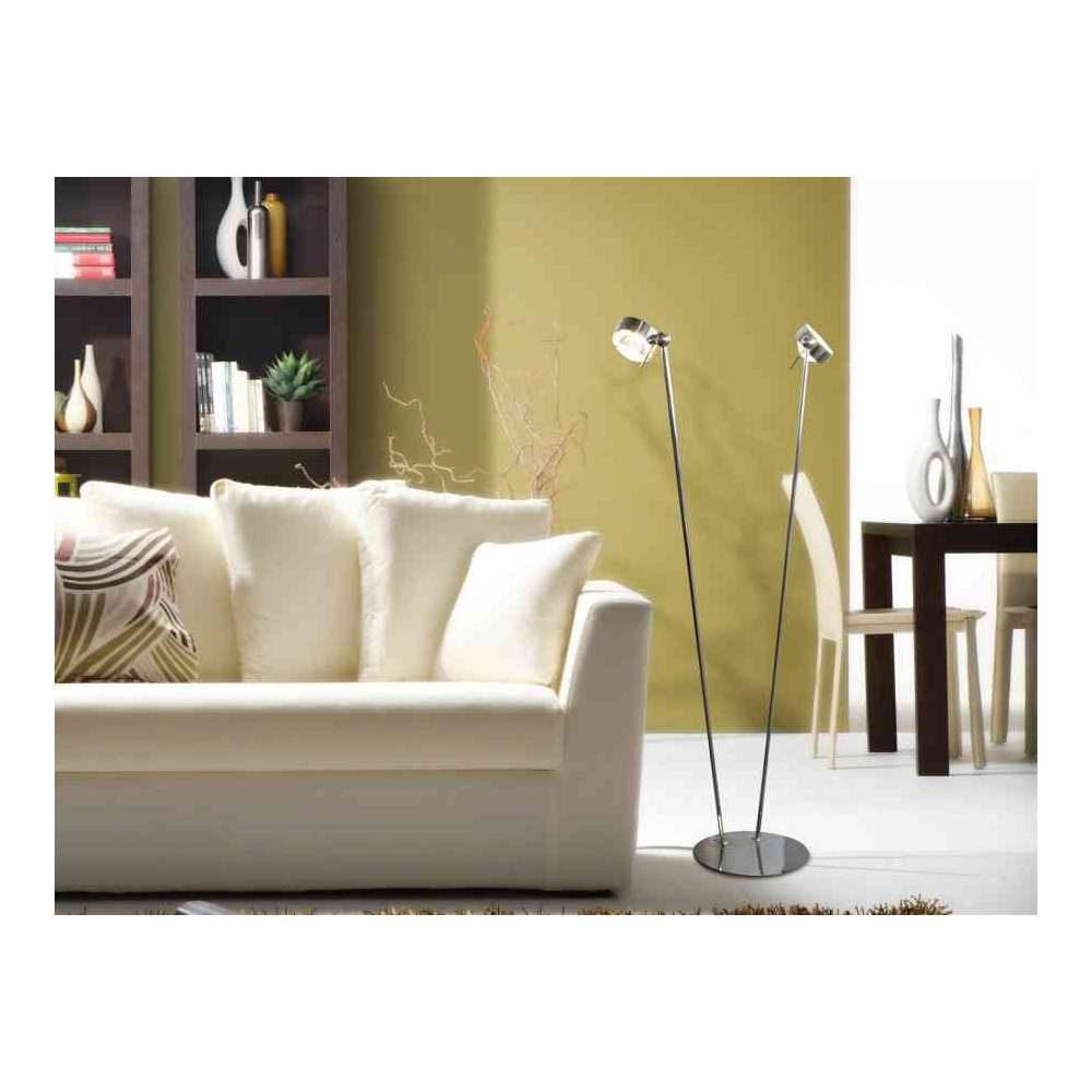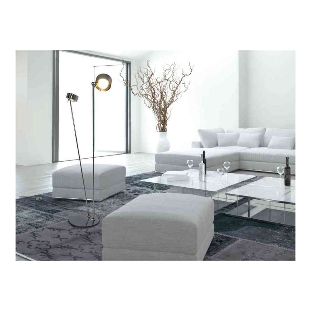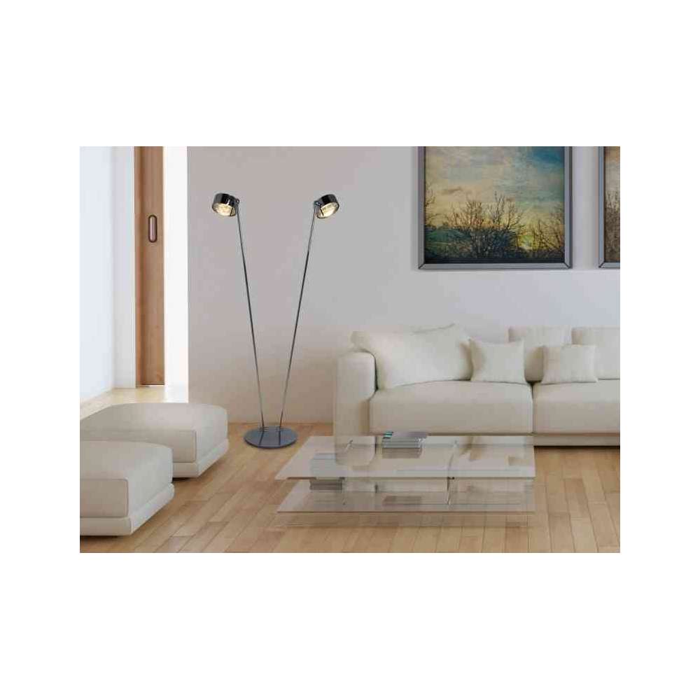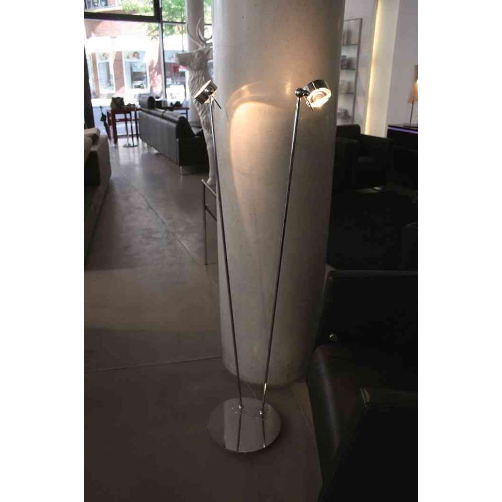 Puk Floor Sister w chromowanych powierzchniach, chrom mat, nikiel mat, biały, czarny i antracyt. Dwie ręce z jedną głową. Długość ramienia: 125 cm. Lampy Puk mogą być wyposażone w okulary, soczewki i filtry barwne z serii "Puk equipment".