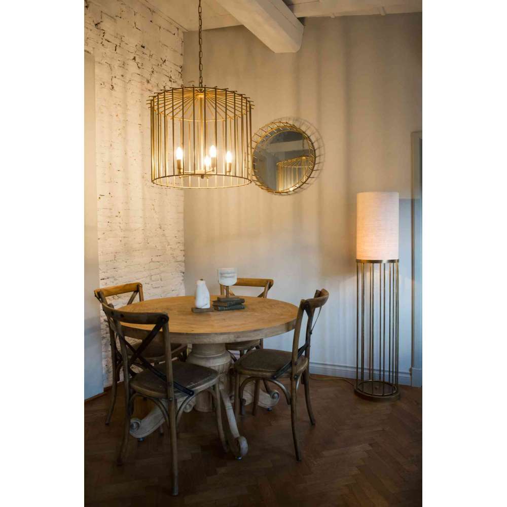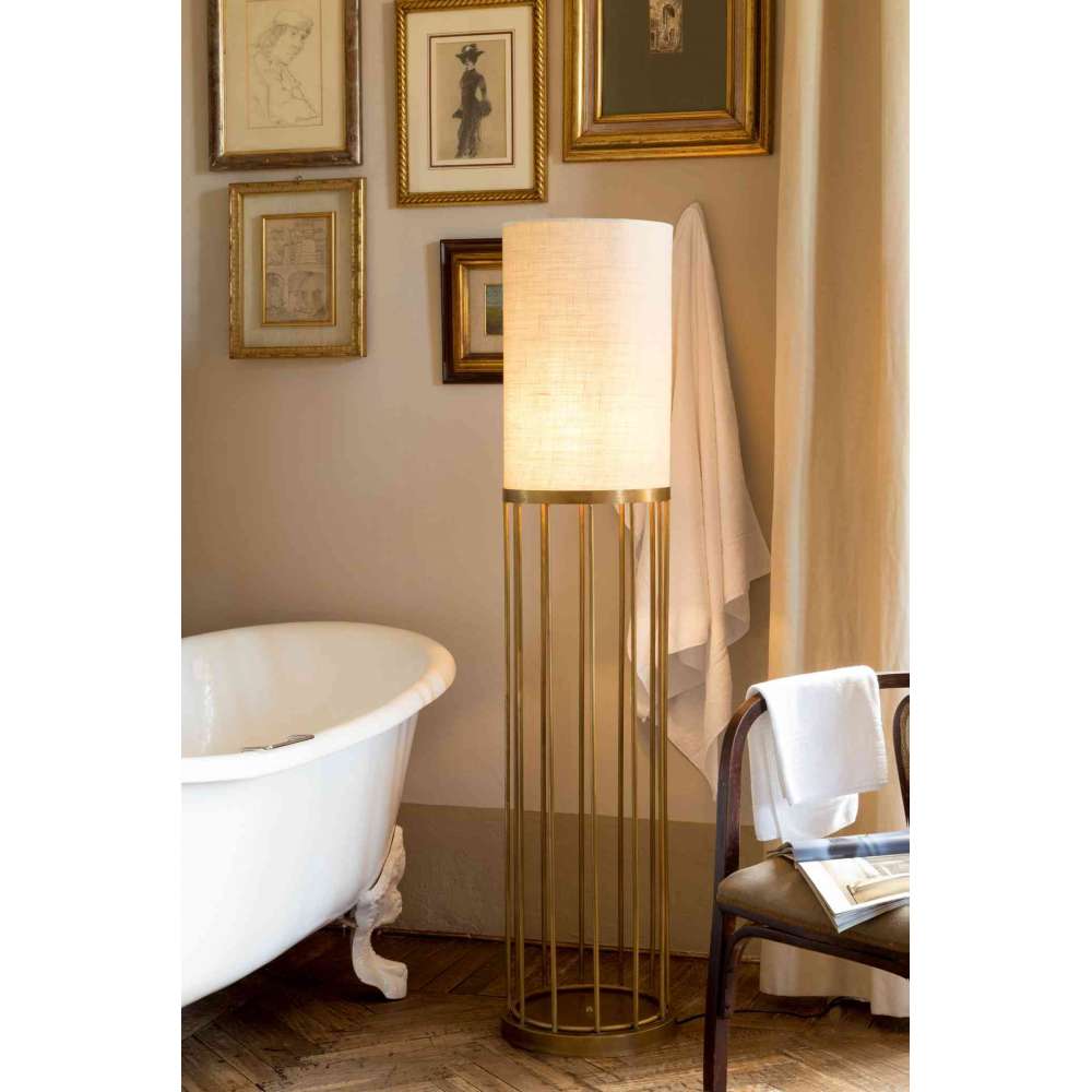 Mosiężna lampa podłogowa z kloszem z tkaniny z różnych materiałów.