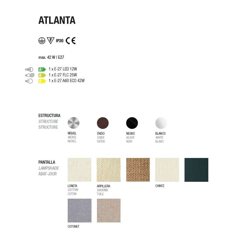 Kolekcja Atlanta opiera się na ruchu ramienia przegubowego z przegubem kulowym pośrodku, który umożliwia jego obracanie, rozciąganie lub kurczenie. Lampa podłogowa Atlanta bardzo dobrze dopasowuje się zarówno do sypialni kontraktowych, jak i prywatnych. Materiały i wykończenia Niklowa struktura. Biały bawełniany klosz Przezroczysty kabel z włącznikiem/wyłącznikiem Charakterystyka elektryczna 1 żarówka E-27 LED 12W Maks. 42W (żarówka nie jest dołączona)Odbiorca: :