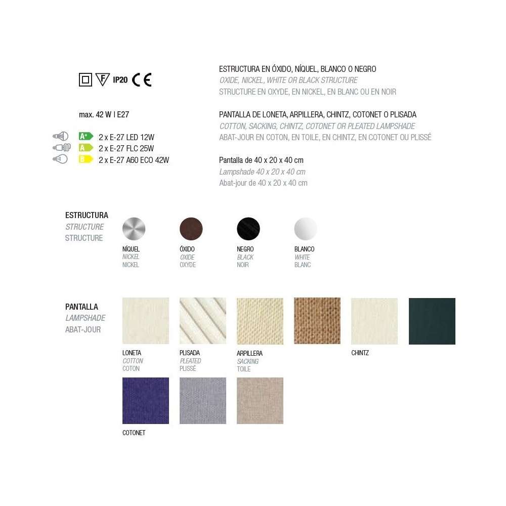 Lampa podłogowa Nautic to klasyczna seria z naszego katalogu. Ta lampa jest funkcjonalna i wszechstronna, która tworzy różne atmosfery. Nada więcej charakteru i jakości każdemu rodzajowi otoczenia. Materiały i wykończenia Struktura niklowa, czarna lub tlenkowa. Odcień z bawełny (różne wykończenia) Przezroczysty przewód z włącznikiem/wyłącznikiem. Charakterystyka elektryczna 2 żarówki x E-27 LED 12W Maks. 42W (nie zawiera żarówek)Odbiorca: :
