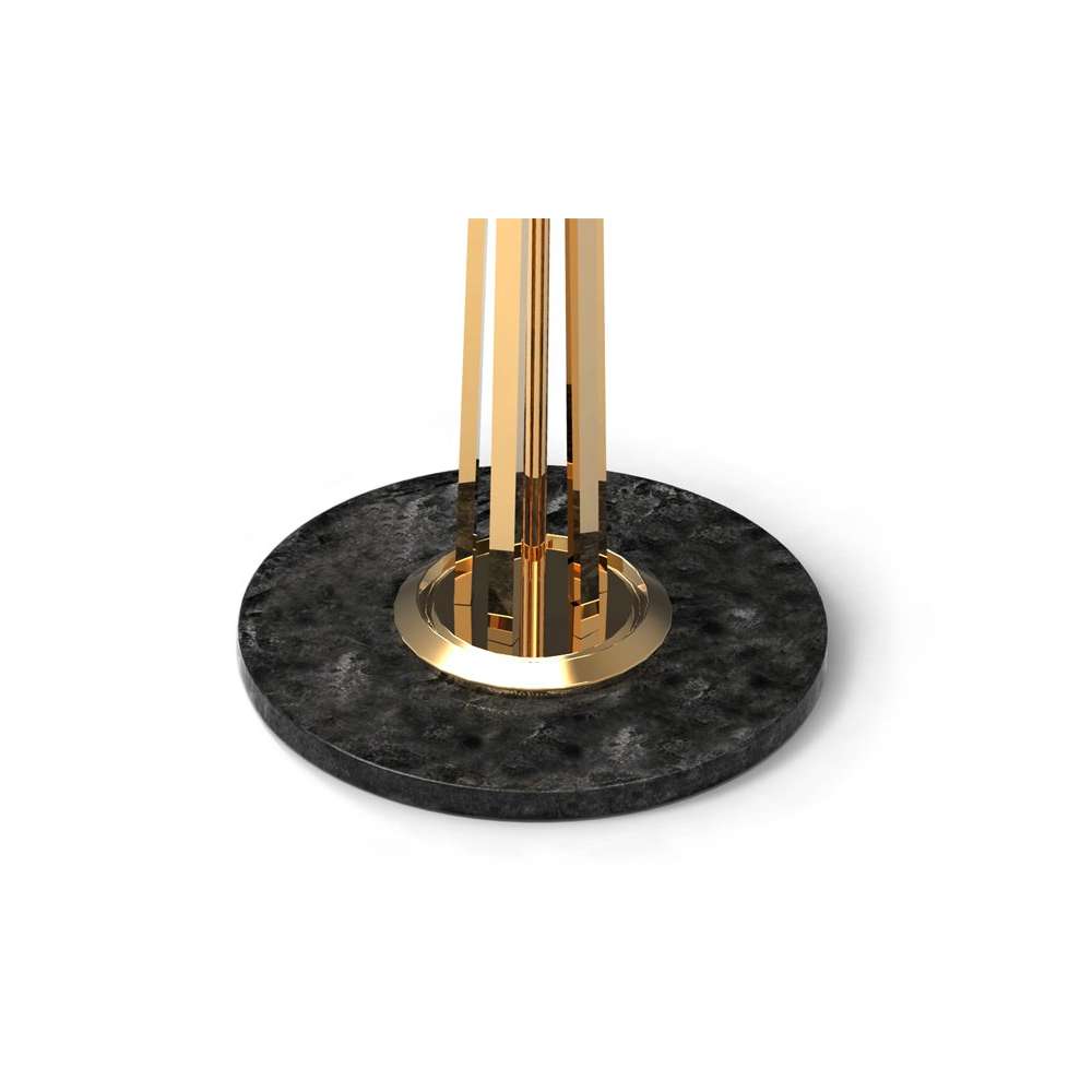 MILES - Lampa stojąca Miles to idealny narożnik do hotelowego holu lub luksusowego salonu lub sypialni. Ma zrównoważoną elegancję i prezencję. Wykonany z myślą o środowiskach architektonicznych, ma elegancki i delikatny kształt. Ten element oświetleniowy jest wykonany ręcznie z mosiądzu, jego duża abat-jour z aluminium, a podstawa z marmuru. Klosz: Kolor lakierowany RAL. Rama: chromowana lub pozłacana. Podstawa: Czarny marmur Portoro. WYMIARY: Wysokość: 69,7” | 177cm . Średnica: 25,6” | 65cm. LAMPY: Żarówki E14 3x.