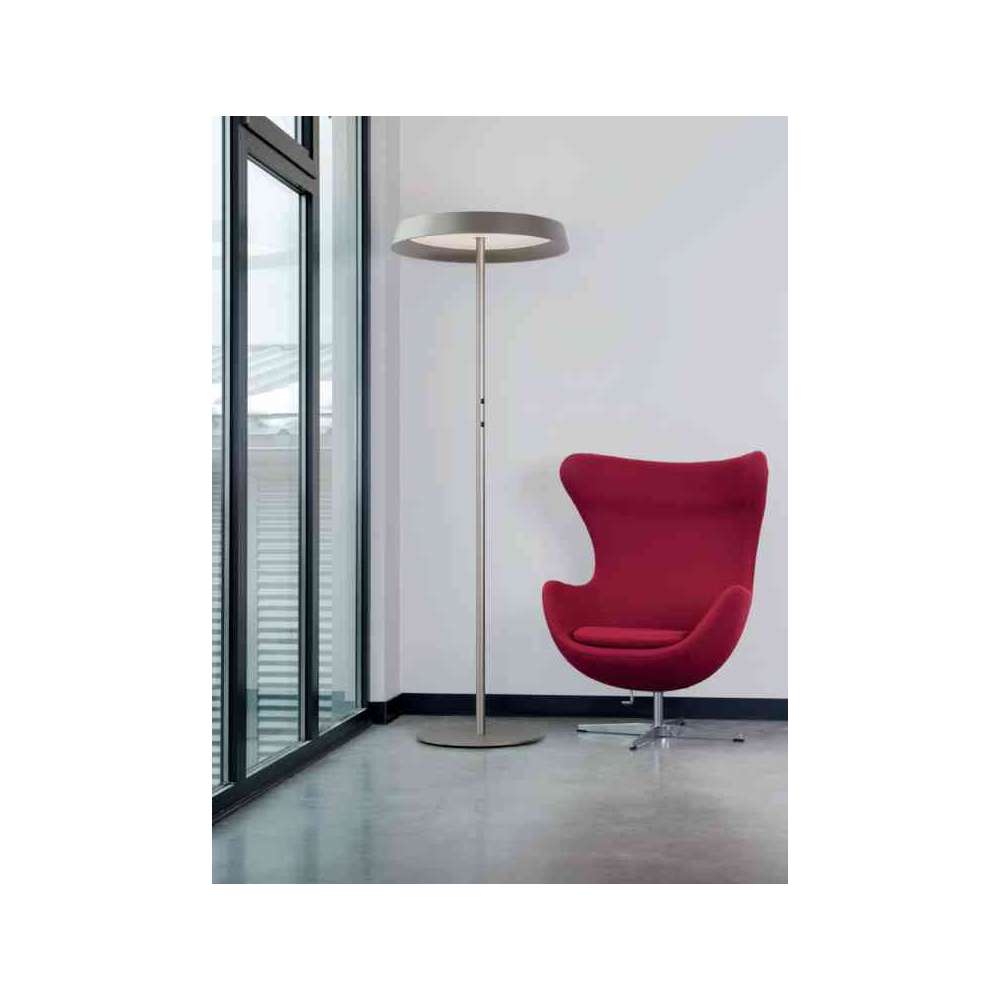 Ekran mikropryzmatyczny ze zoptymalizowaną redukcją olśnienia, szczególnie w miejscach pracy. Satynowy dyfuzor opalowy do oświetlenia ogólnego o maksymalnej przepuszczalności i równomiernym oświetleniu. Światło pośrednie z innowacyjną technologią soczewek do szerokokątnego oświetlenia sufitu. Dwa przyciski w słupie oprawy do oddzielnego ściemniania i przełączania światła bezpośredniego/pośredniego. Temperatury barwowe 2200K, 2700K, 3000K, 3500K, 4000K lub 6500K. Binning początkowy ≤ MacAdam 3. Oddawanie barw CRI>80 lub CRI>90. Okrągła płyta podstawy wykonana ze stali, dopasowana kolorystycznie do korpusu oprawy.
