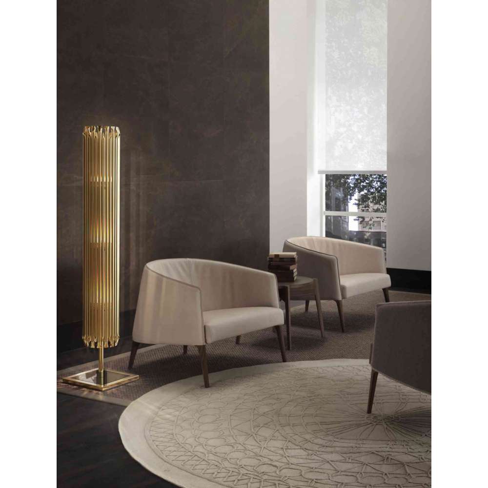 Lampa podłogowa Matheny stilnovo na nowo wymyśliła klasyczne projekty z wysokimi wyczuciem estetycznym. Czerpiąc inspiracje od amerykańskiego gitarzysty jazzowego Pata Metheny'ego, projektanci DelightFULL stworzyli lampę, która łączy w sobie elementy progresywnego, mid-century i współczesnego designu. Ta wysoka lampa podłogowa o wysokości 65 cali składa się z geometrycznych złotych rurek, które odzwierciedlają wyrafinowanie połowy lat 50.