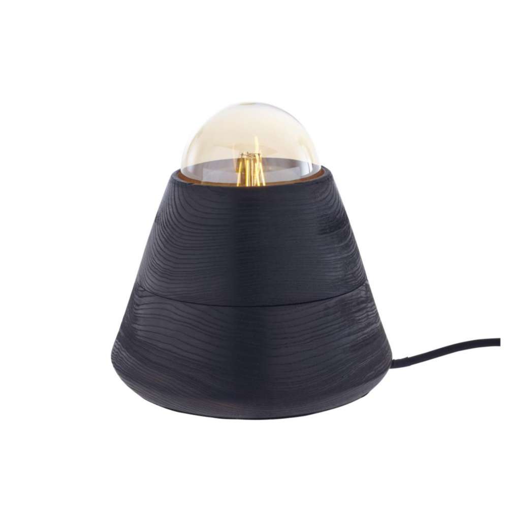 Lampa stołowa z podstawą z jesionu, z zewnątrz oświetlona i pozostawiona w naturalnym wnętrzu „krateru”. Kabel tekstylny w kolorze czarnym. Czarny ręczny przełącznik/ściemniacz. Żarówka kulista LED 4W E27 z bursztynowym żarnikiem Ø 95 mm, temperatura barwowa 2200 K (ciepła biel), 320 lumenów.