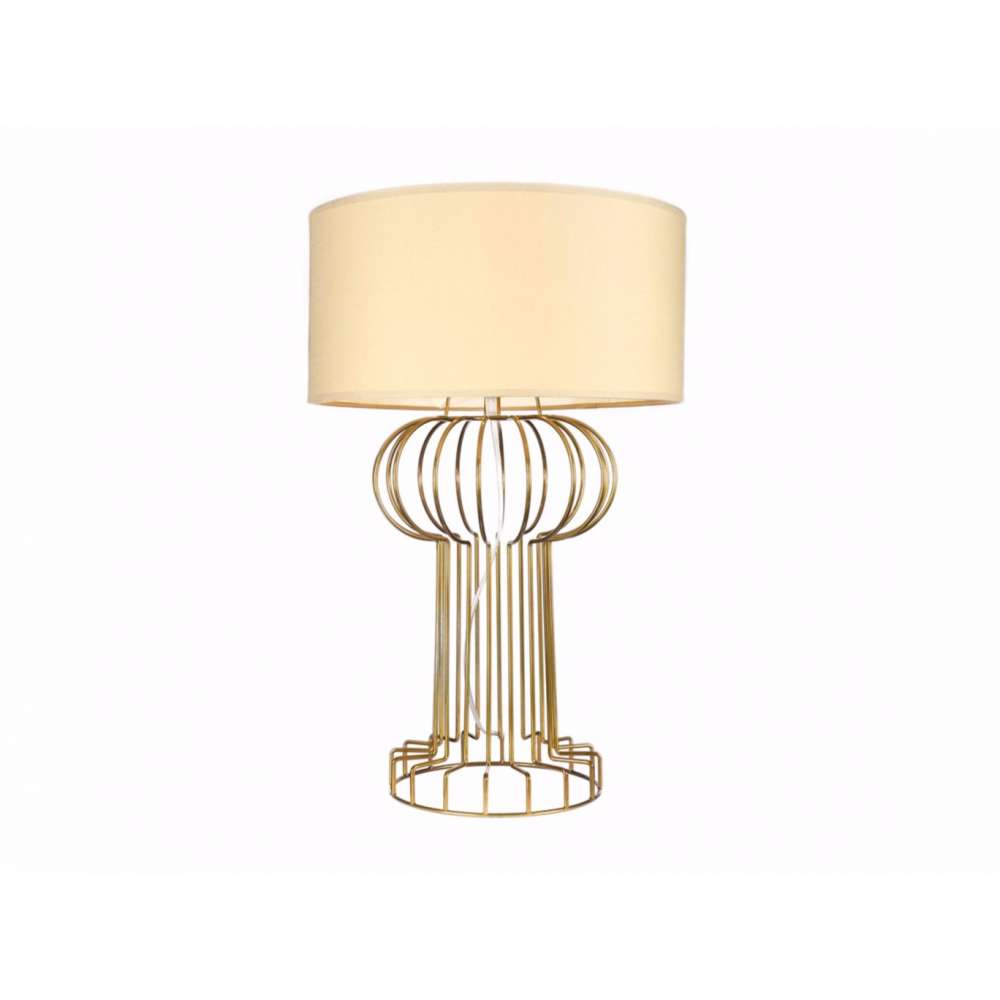 Lampa stołowa z metalową konstrukcją w złotym lub miedzianym wykończeniu na żarówkę E27 (brak w zestawie), z możliwością wyboru klosza w splocie Beżowym lub Romul.
