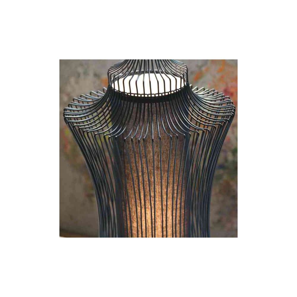 Lampa stołowa z drutu metalowego pomalowanego na czarno.