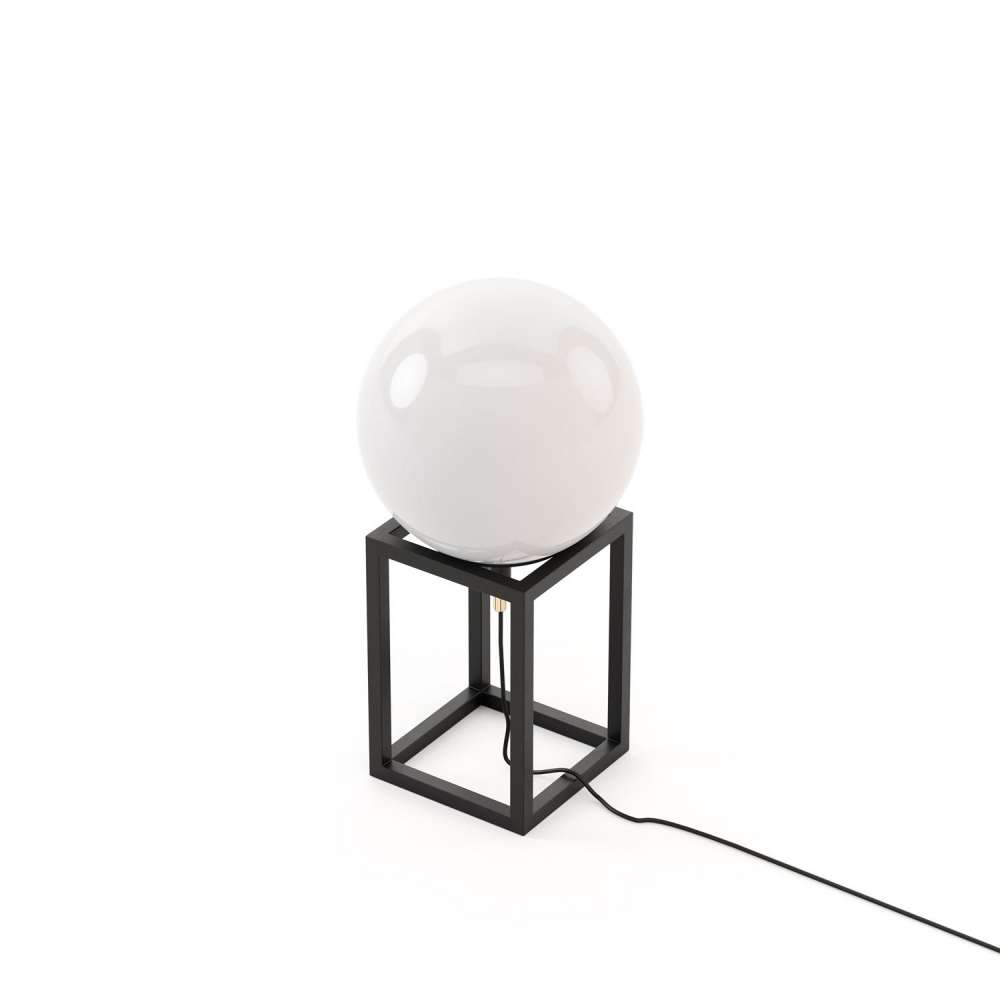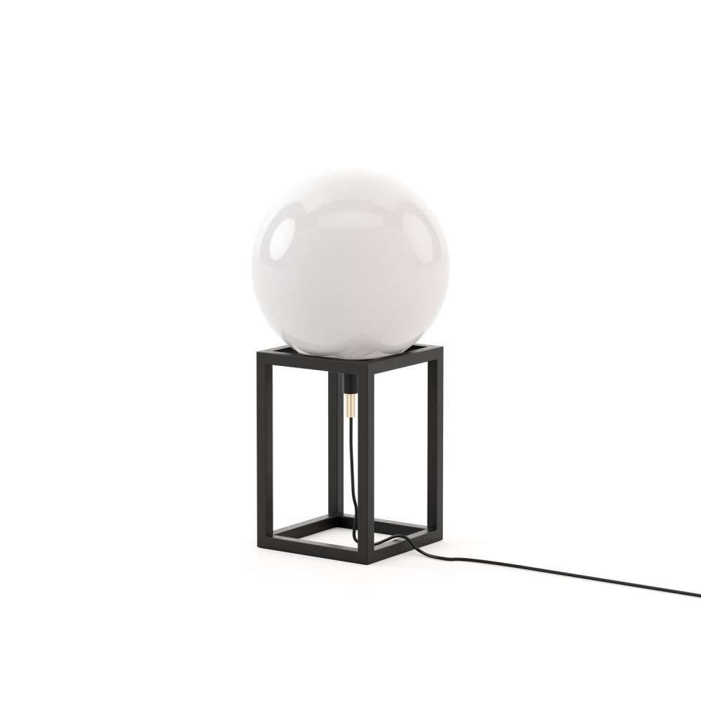 Lampa stołowa Jones nadaje się do wnętrz lub na zewnątrz. Dzięki żelaznej konstrukcji w kształcie kwadratu, jej minimalistyczny design stwarza nowe perspektywy na oświetlenie otoczenia. Okrągła bańka, z przezroczystego szkła, płynnie kontrastuje kształtem i materiałami ze strukturą.