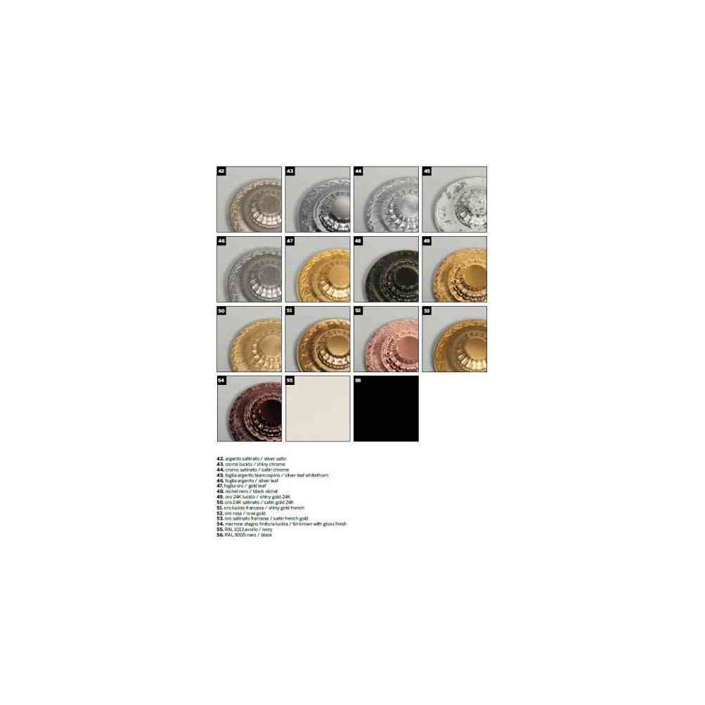 Wykończenie : czarny nikiel i lśniące złoto / czarny nikiel i różowe złoto. Inne wykończenia na zamówienie. Kolory : korpus centralny w kolorze brązowym, w kolorze granatowym. Inne kolory na życzenie. Szczegóły : centralny korpus z ręcznie dmuchanego szkła wyprodukowany w Toskanii. Elementy mosiężne. Zdobiony metalowymi elementami kwiatowymi ze srebrnymi spawami. Elementy kwiatowe wykonujemy ręcznie na podstawie naszego rysunku. Odcień 34/68 mod. stożek z różową tkaniną pongè i szarą organzą. Odcień 34/61mod. stożek ze złotą tkaniną ponge i brązową organzą.Odbiorca: :