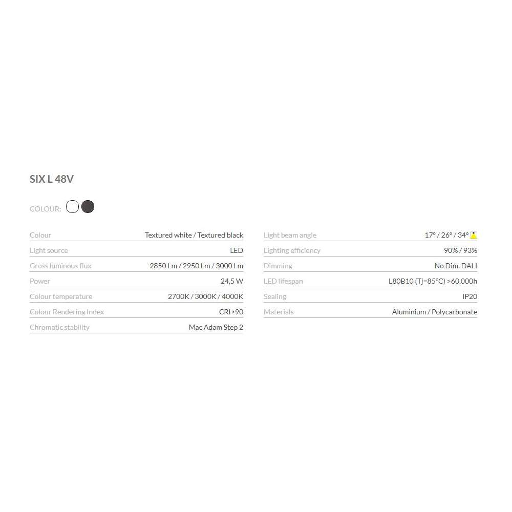Six 48V to rodzina reflektorów do zastosowań niskonapięciowych, która wyróżnia się lekkością i elegancją. Dostępny w rozmiarach L, M, S, XS i XS Double, jego korpus, przypominający dysk, zaokrąglony kształt, zawiera innowacyjną kombinację odbłyśnika i soczewki. Połączone działanie obu, pozwala Six kierować promienie światła z maksymalną jednolitością na bardzo małą odległość, co jednocześnie umożliwiło jej zróżnicowany design - zredukowany i minimalistyczny -. Ponadto Six może być swobodnie przegubowy dzięki przewiewnemu ramieniu, które pozwala skierować reflektor w dowolnym kierunku.