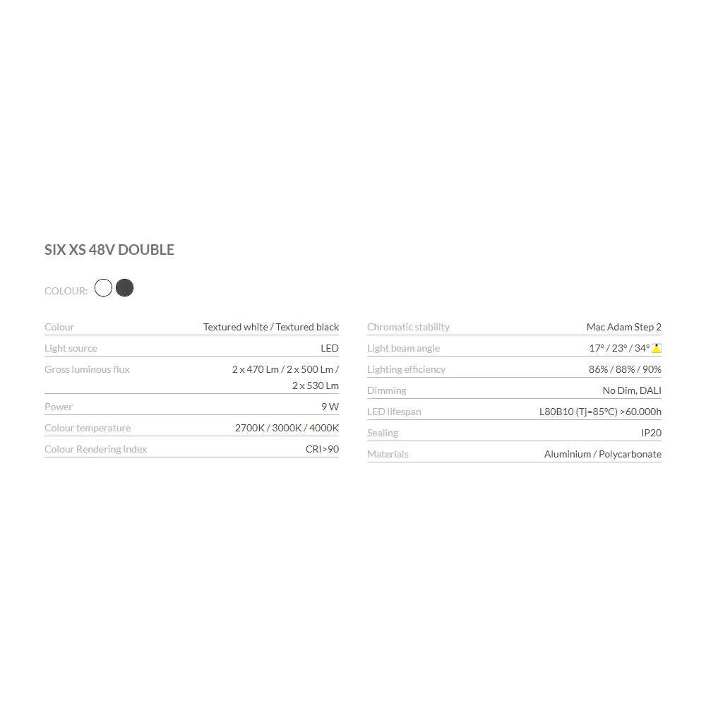Six 48V to rodzina reflektorów do zastosowań niskonapięciowych, która wyróżnia się lekkością i elegancją. Dostępny w rozmiarach L, M, S, XS i XS Double, jego korpus, przypominający dysk, zaokrąglony kształt, zawiera innowacyjną kombinację odbłyśnika i soczewki. Połączone działanie obu, pozwala Six kierować promienie światła z maksymalną jednolitością na bardzo małą odległość, co jednocześnie umożliwiło jej zróżnicowany design - zredukowany i minimalistyczny -. Ponadto Six może być swobodnie przegubowy dzięki przewiewnemu ramieniu, które pozwala skierować reflektor w dowolnym kierunku.