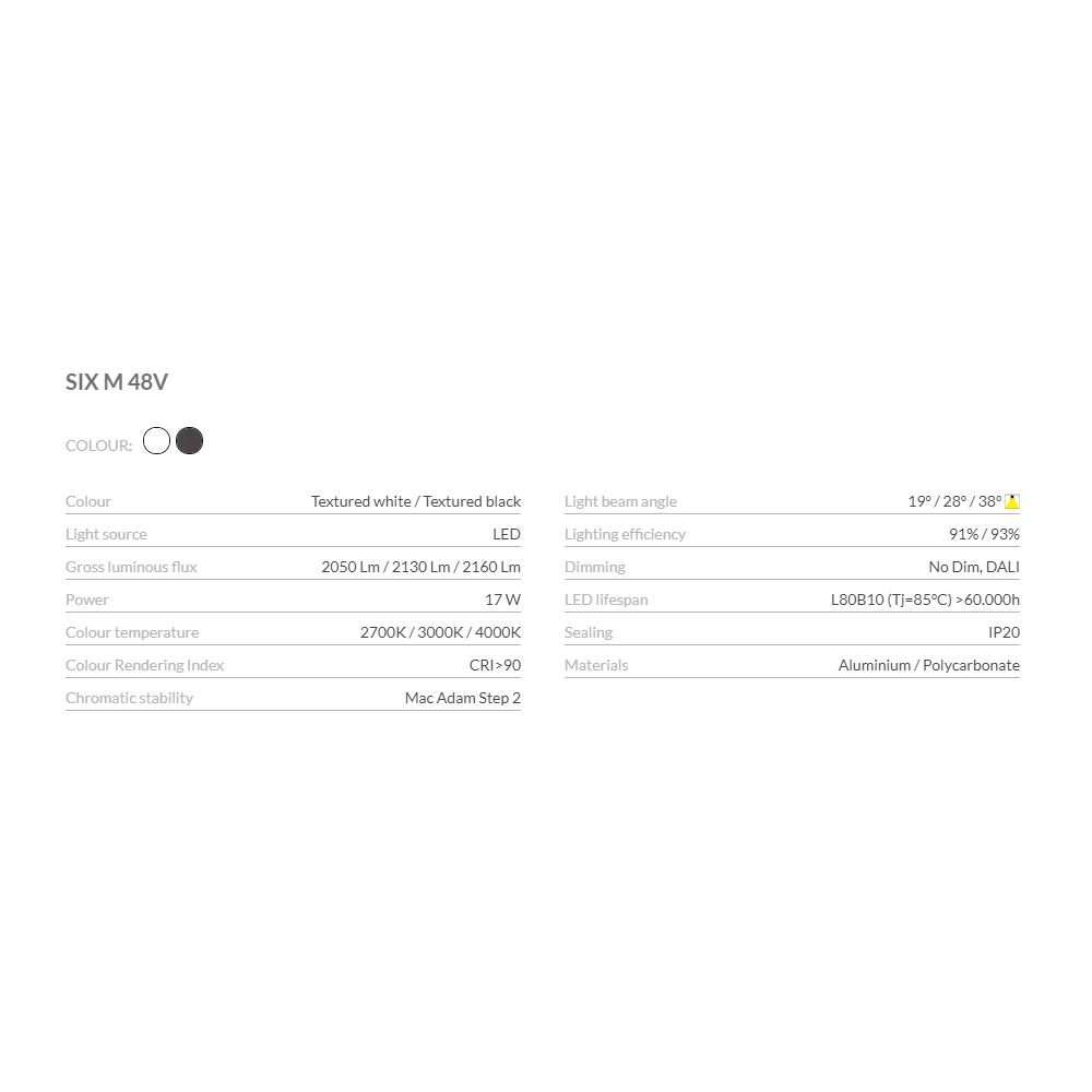 Six 48V to rodzina reflektorów do zastosowań niskonapięciowych, która wyróżnia się lekkością i elegancją. Dostępny w rozmiarach L, M, S, XS i XS Double, jego korpus, przypominający dysk, zaokrąglony kształt, zawiera innowacyjną kombinację odbłyśnika i soczewki. Połączone działanie obu, pozwala Six kierować promienie światła z maksymalną jednolitością na bardzo małą odległość, co jednocześnie umożliwiło jej zróżnicowany design - zredukowany i minimalistyczny -. Ponadto Six może być swobodnie przegubowy dzięki przewiewnemu ramieniu, które pozwala skierować reflektor w dowolnym kierunku.