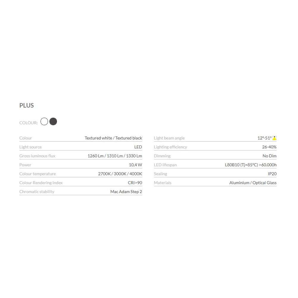 Plus to reflektor, który oferuje możliwość rozszerzenia lub skupienia rozwarcia wiązki światła poprzez delikatny ruch ręczny. Jego układ optyczny składa się z soczewki kolimacyjnej i wysuwanego ekranu typu „snoot”. Dzięki ręcznemu działaniu użytkownika, obiektyw i nasadka działają jak zoom (oddalanie się lub zbliżanie do diody LED), umożliwiając regulację kąta rozsyłu światła od „powodzi”, do „punktu”, pozycji lub odwrotnie. Ta funkcja przekształca Plus w idealny reflektor do zastosowań, w których precyzja wiązki światła jest kluczowym elementem, takich jak muzea, wystawy, sklepy lub aplikacje akcentujące.