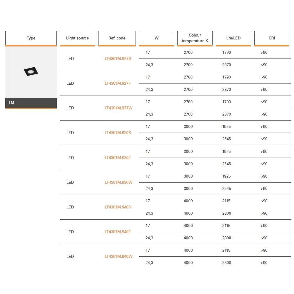 Celownik to regulowany projektor do wbudowania bez przycinania, wyposażony w źródło COB LED. Kwadratowa lub prostokątna malowana konstrukcja stalowa z jednym lub kilkoma źródłami światła. Zdejmowana i regulowana teleskopowa jednostka optyczna. Wersja bez wykończenia wymaga koniecznie ramy montażowej do montażu na sufitach z płyt gipsowo-kartonowych o grubości 13 mm. Wyposażony w wysokowydajne diody LED, CRI> 90, wysokowydajny pasywny radiator z czarnego anodowanego wytłaczanego aluminium i metalizowany odbłyśnik z 99,99% aluminium. Do powiązania ze zdalnymi sterownikami. W razie potrzeby mogą być realizowane z widmami dla ogrodnictwa. Szalunek z ekstrudowanego aluminium do montażu w betonie dostępny jako akcesorium. IP20/IP23.