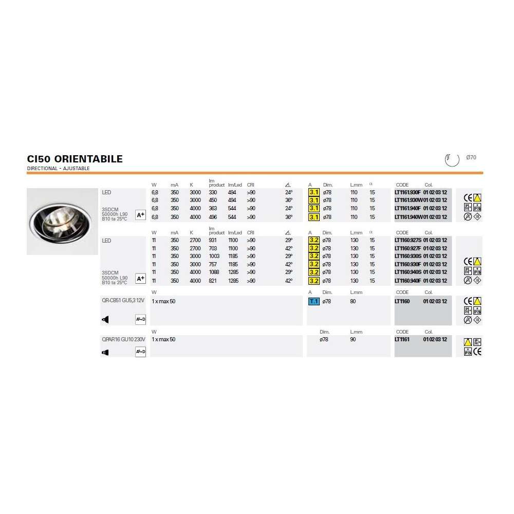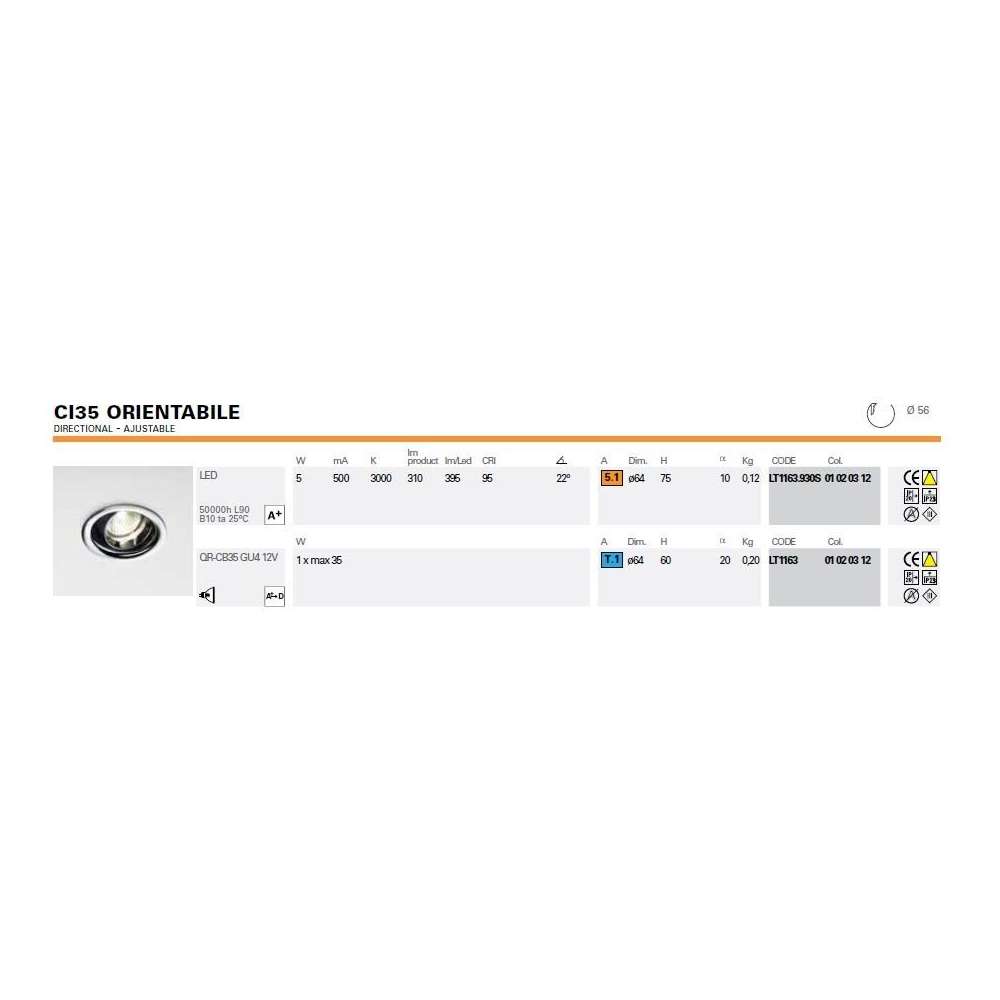 Wewnętrzna oprawa ścienna/sufitowa wpuszczana do fałszywej ściany lub cegieł, bezpośrednie światło, okrągły kształt stały lub regulowany model malowany lub ocynkowany metalowy korpus i części mechaniczne w okablowaniu stalowym do niskonapięciowych lamp halogenowych, metalohalogenkowych HQI 35W (brite spot) do inspekcji sufitu. Ze statecznikiem elektronicznym lub elektromagnetycznym na życzenie wersja z formą do ścian i sufitów betonowych. Downlight do wbudowania do montażu na ścianie i suficie, mocowany lub regulowany do zintegrowanego źródła LED lub do halogenu/LED QR-CB 35, QR-CB 51, QR -Lampy LP 111 12V/230V, QPAR16. Zdalny zasilacz dostępny jako akcesorium. Korpus, super smukły 18mm. rama szerokości i grupa optyczna z malowanego lub chromowanego metalu. Może być również instalowany w ścianach betonowych lub ceglanych za pomocą specjalnej skrzynki ściennej wykonanej ze stali ocynkowanej lub aluminium, dostępnej jako wyposażenie dodatkowe. Stopień ochrony IP20.Odbiorca: :