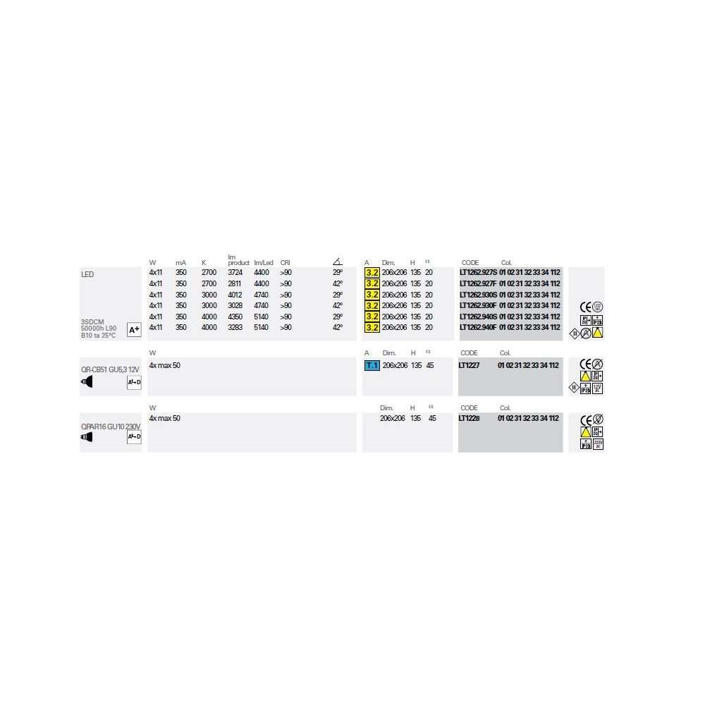 Reflektor wpuszczany do montażu na ścianie i suficie, z wysuwanym i regulowanym monoklem, do zintegrowanego źródła LED lub do lamp halogenowych/LED QR-CB 51 GU5,3 12V/230V, QPAR16 GU10. Dostępna w wersji z ramką lub bez wykończenia. Korpus z malowanego metalu. Teleskopowy monokl i supercienka rama o szerokości 10 mm z malowanego lub chromowanego metalu. Wysuwana grupa optyczna 40 mm, regulowana 355° w poziomie i ±20/45° w pionie. Zasilacz zdalny dostępny jako akcesorium. Może być również montowany w ścianach betonowych lub ceglanych za pomocą specjalnej skrzynki ściennej ze stali ocynkowanej, dostępnej jako akcesorium. Stopień ochrony IP20.