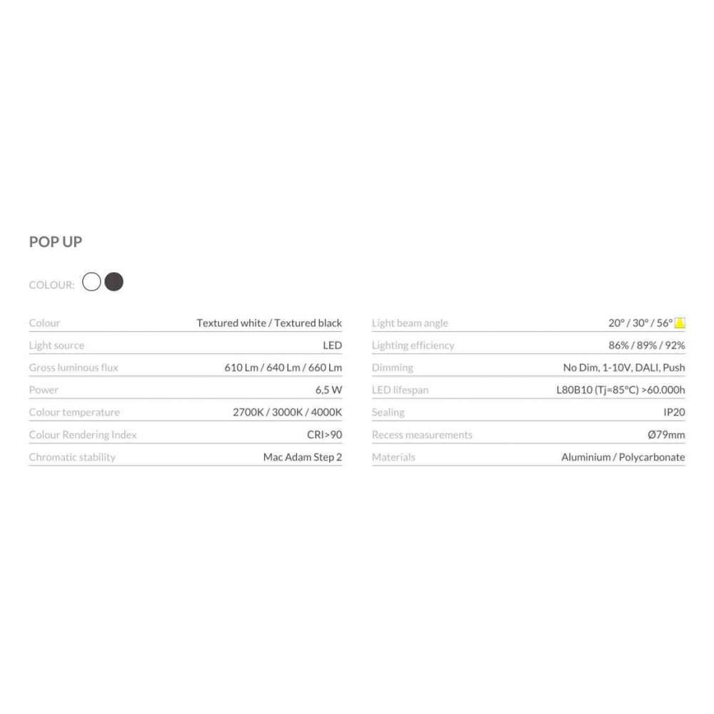Pop Up to jeden z najmniejszych reflektorów wpuszczanych na świecie. Łączy swój mały format z formalnym minimalizmem, aby stworzyć idealną oprawę do projektów, które wymagają najmniejszej inwazji przestrzeni. Pop Up jest w stanie oddać strumień świetlny, który pozwala na pełnienie funkcji oświetlenia akcentującego z sufitu. Można go przesuwać praktycznie we wszystkich stopniach swobody, ponieważ obraca się o 355 ° i może przechylać o 90 ° (w przeciwieństwie do większości innych wpuszczanych na rynku). Można go łatwo i płynnie przesuwać ręcznie.Odbiorca: :