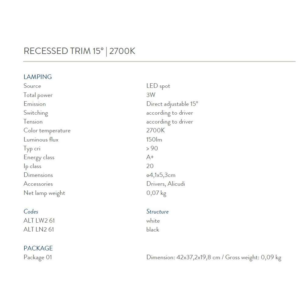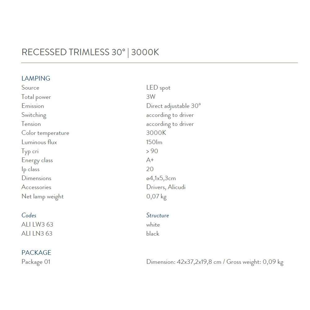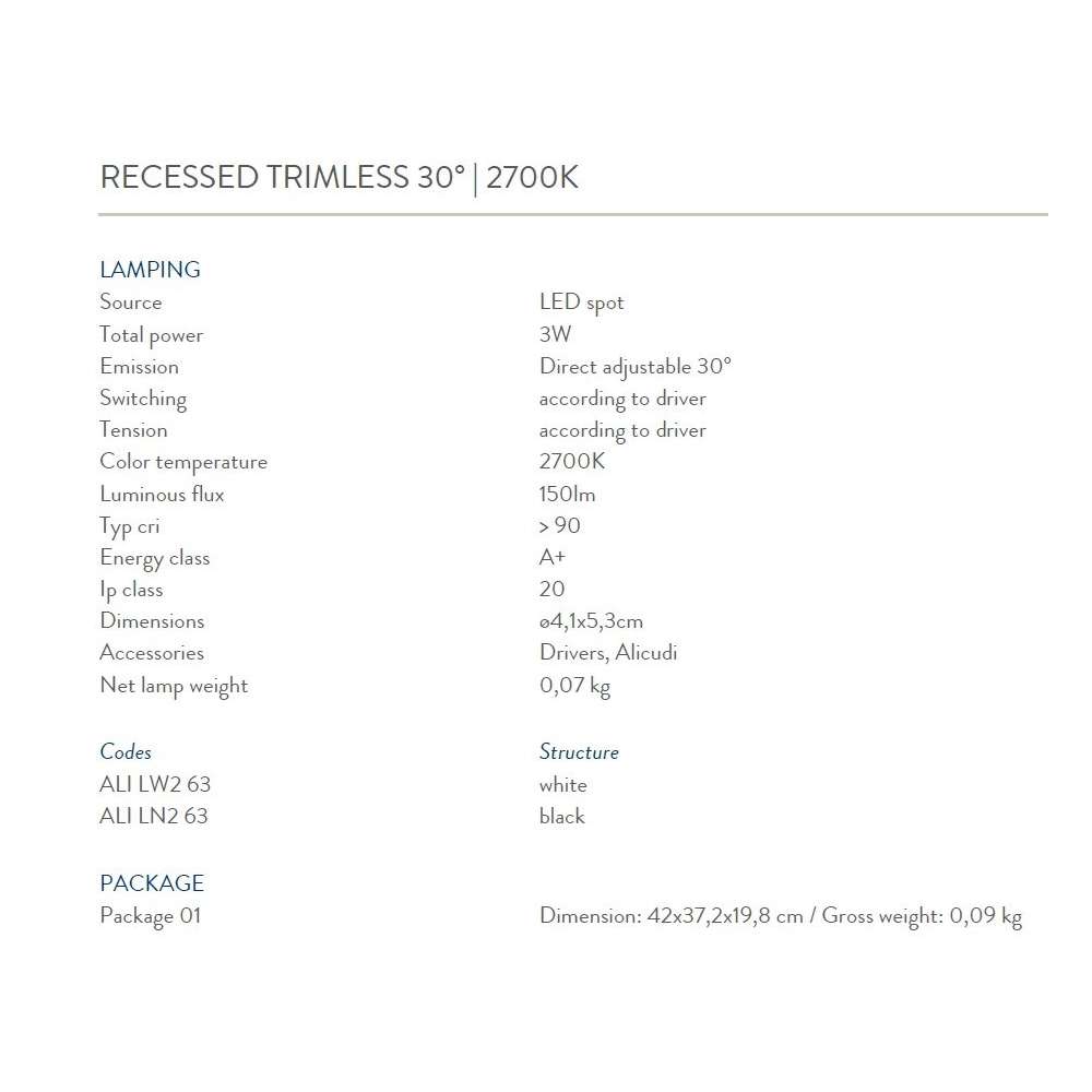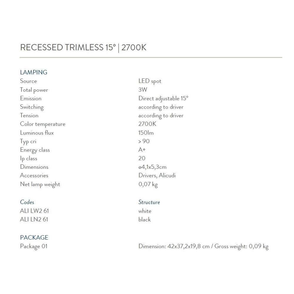 Rodzina wpuszczanych opraw typu downlight do wnętrz do oświetlenia akcentującego. Alicudi jest dostępna w różnych wykończeniach, kątach rozsyłu i temperaturach barwowych. Minimalny design, miękkie światło bez oślepiania i łatwa instalacja sprawiają, że Alicudi odpowiedni spot, który spełni każde wymagania projektowe. Spot LED - Ip20 WERSJE WPUSZCZANY TRIMLESS 15° | 2700K / 3000K WPUSZCZANY TRYMLESS 30° | 2700K / 3000K TAPICERKA WPUSZCZANA 15° | 2700K / 3000K TAPICERKA WPUSZCZANA 30° | 2700K / 3000KOdbiorca: :