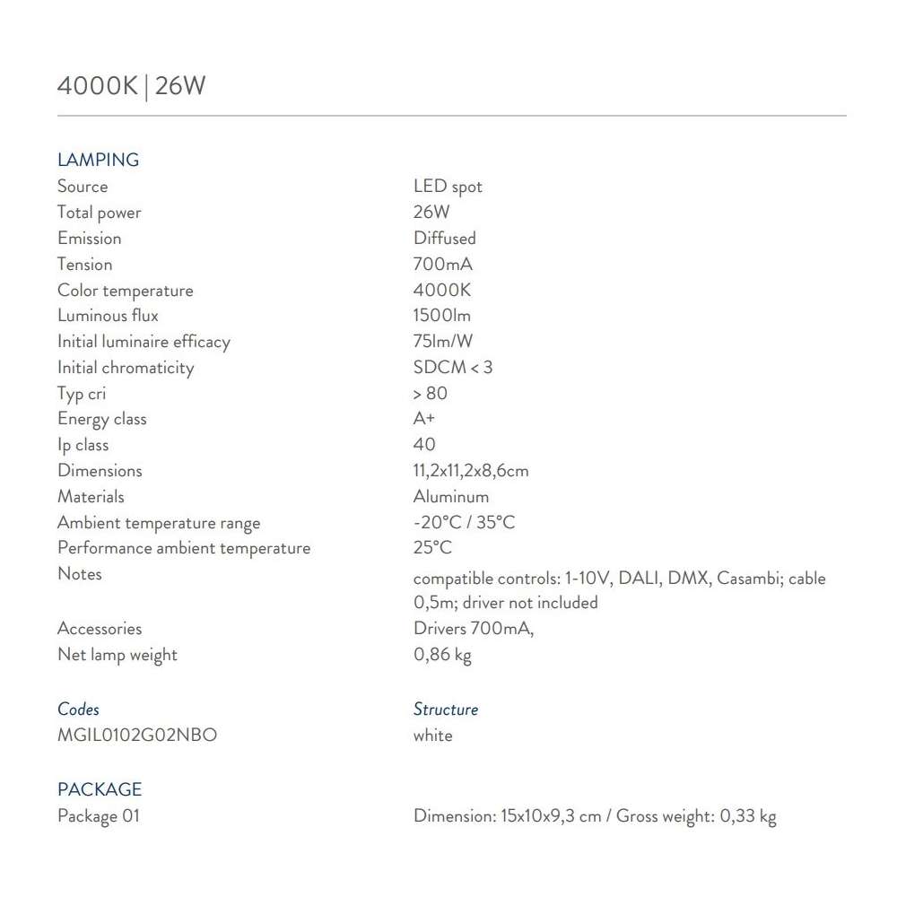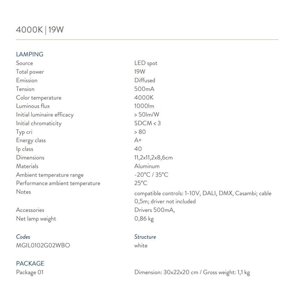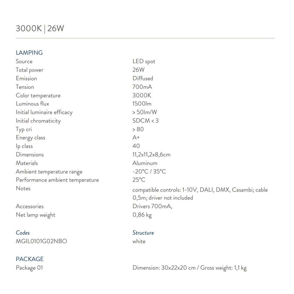 Gildor to wpuszczany spot LED do zastosowań wewnętrznych. Wykończenie malowanie na biało (RAL 9016) i opalizujący ekran umożliwiający jednorodną emisję światła. Gildor jest dostępny w dwóch różnych lumenach pakiety i temperatury barwowe. Spot LED - Ip40 WERSJE - 3000K | 19W / 26W - 4000K | 19W/26WOdbiorca: :