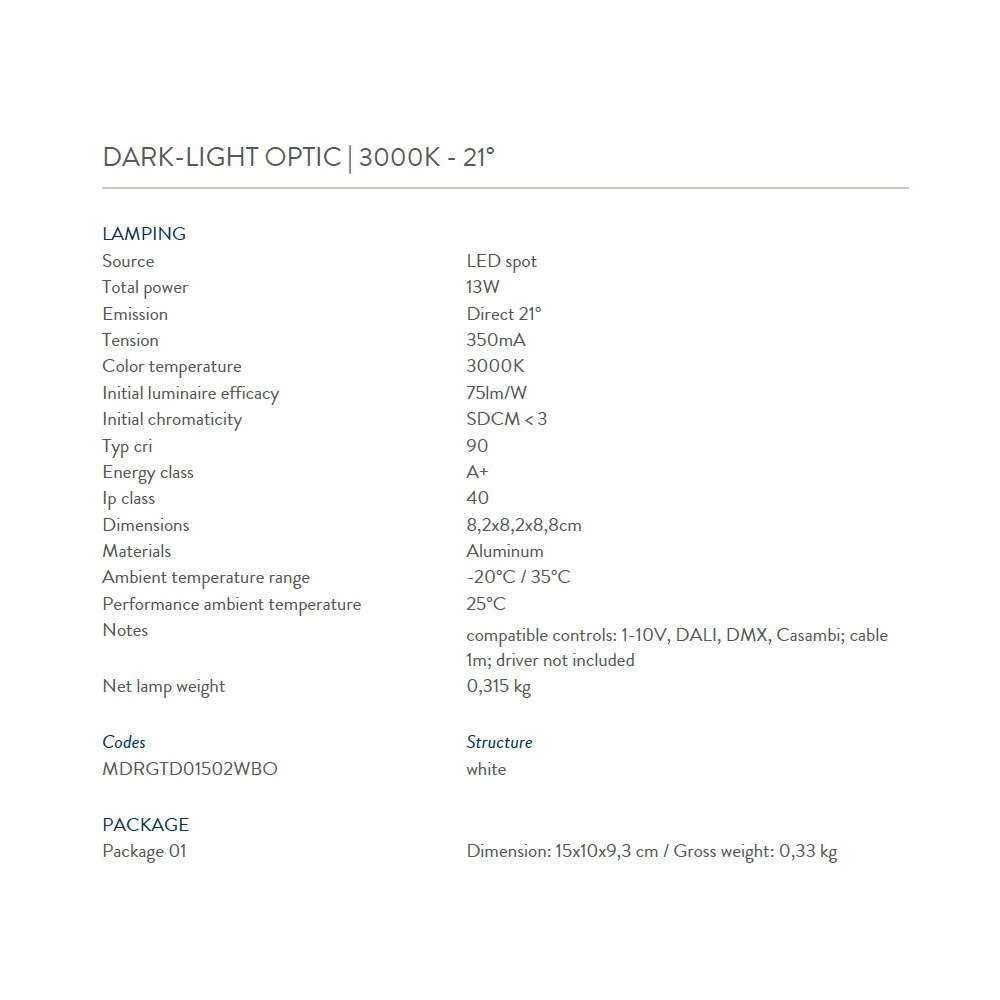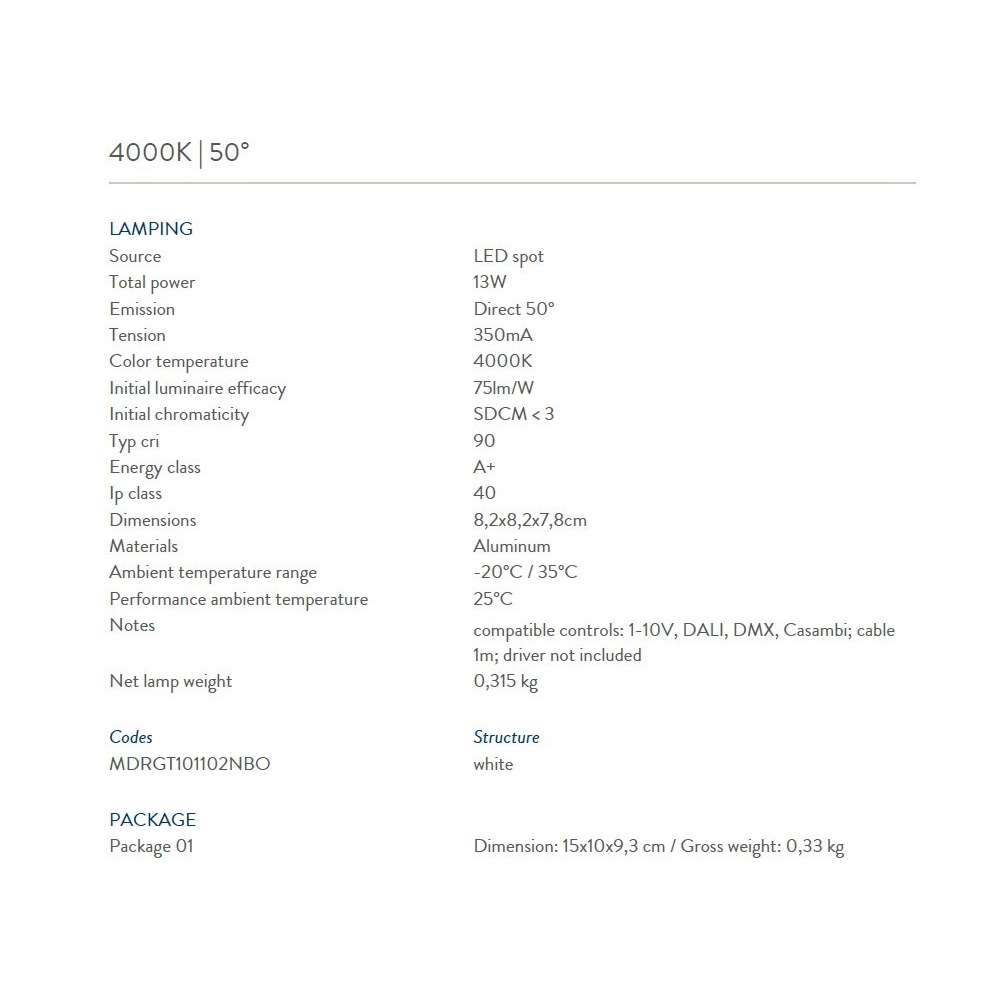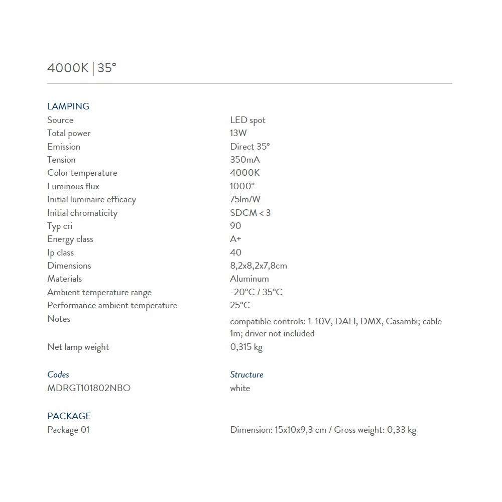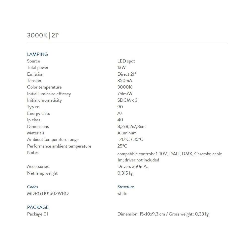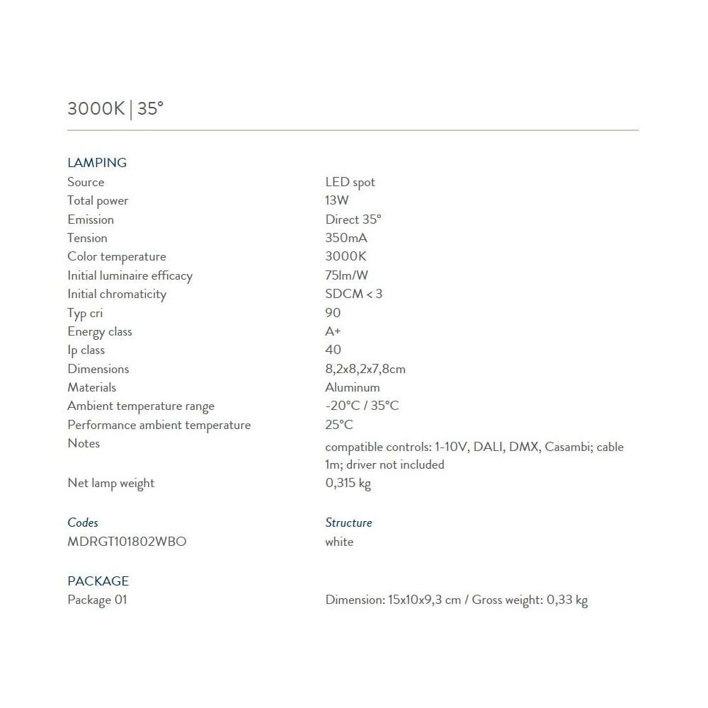 Dragster-T to wpuszczany spot LED do zastosowań wewnętrznych. Obręcz ozdobna wykonana z aluminium lakierowanego na biało (RAL 9016). Dostępna jest w wersji „ciemno-jasnej” z wpuszczaną optyką redukującą olśnienie. Dostępne są trzy różne kąty świecenia i dwie temperatury barwowe. Spot LED - Ip40 WERSJE - 3000K | 21 ° / 35 ° / 50 ° - 4000K | 21 ° / 35 ° / 50 ° - CIEMNO-JASNA OPTYKA | 3000K / 4000K | 21°/35°/50°Odbiorca: :