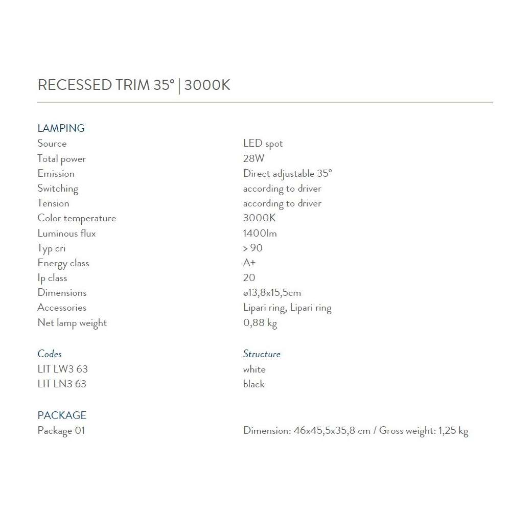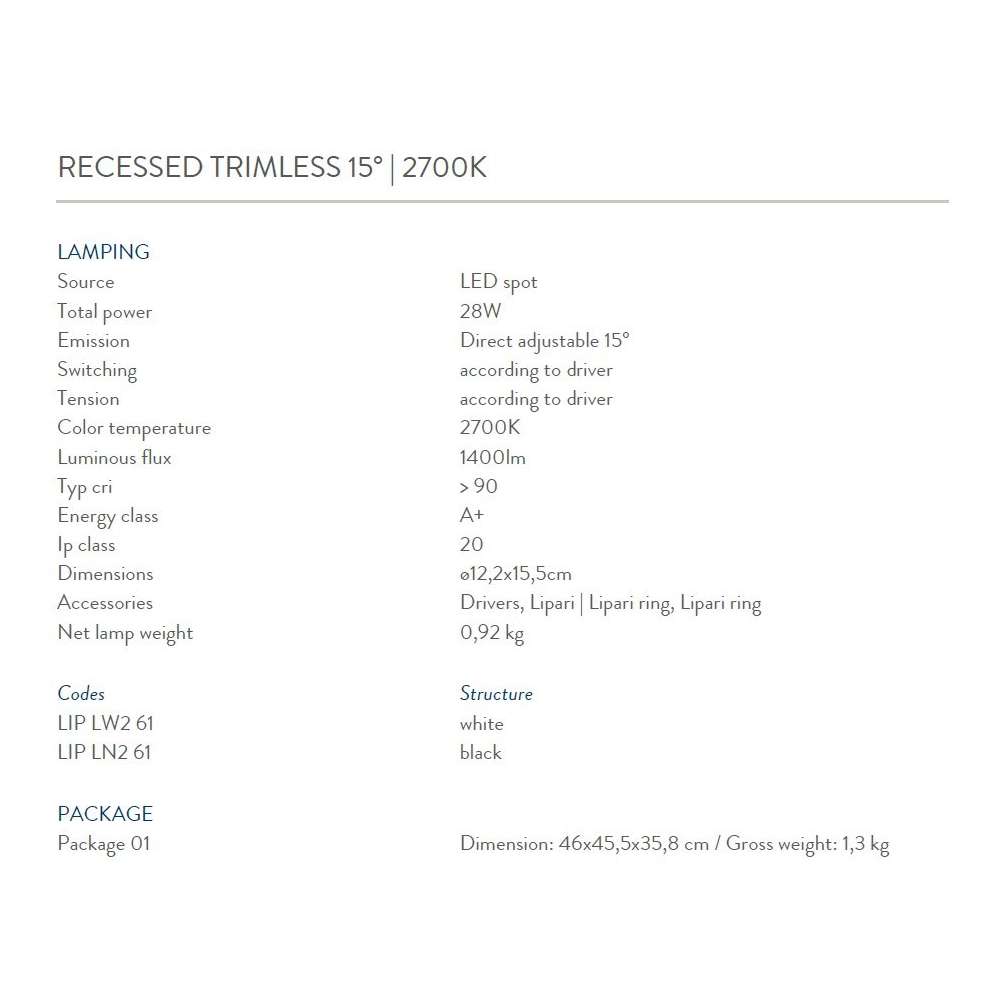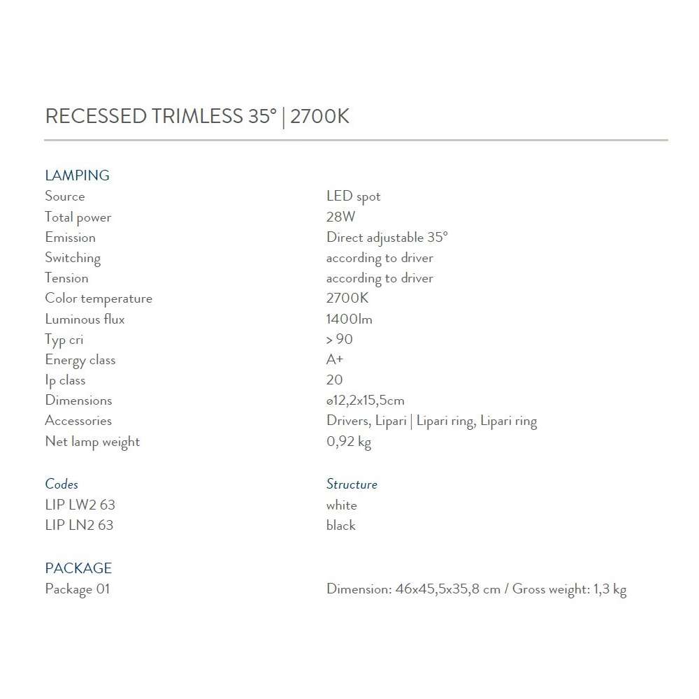 Rodzina wbudowanych opraw typu downlight do oświetlenia akcentującego. Oprawa/oprawa jest obracana o 90° w pionie i 35° w poziomie, aby umożliwić swobodną orientację światła w dowolnym kierunku. Modułowa konstrukcja dzieli lampę na kilka niezależnych części. Zewnętrzne pierścienie o różnych wykończeniach są proste w montażu i można je łatwo wymienić, aby spełnić różne wymagania dotyczące otwierania i efektów wizualnych. Dostępnych jest wiele akcesoriów optycznych, aby uzyskać różne efekty świetlne. LED Spot - Ip20 WERSJE WPUSZCZANE TRIMLESS 15 ° / 35 ° | 2700K / 3000K PROFIL WPUSZCZANY 15 ° / 35 ° | 2700K / 3000KOdbiorca: :