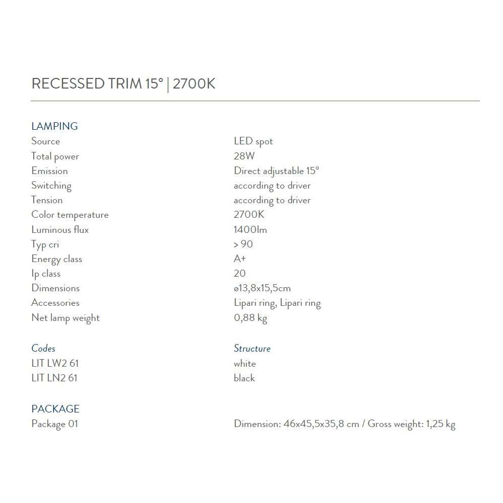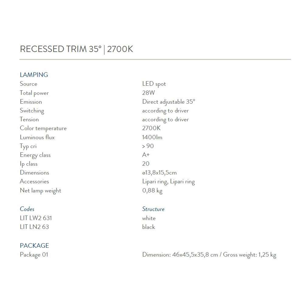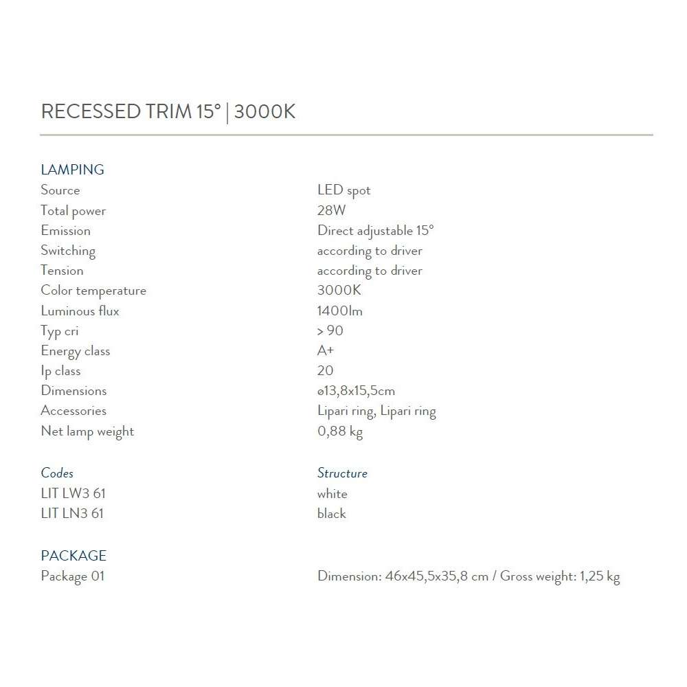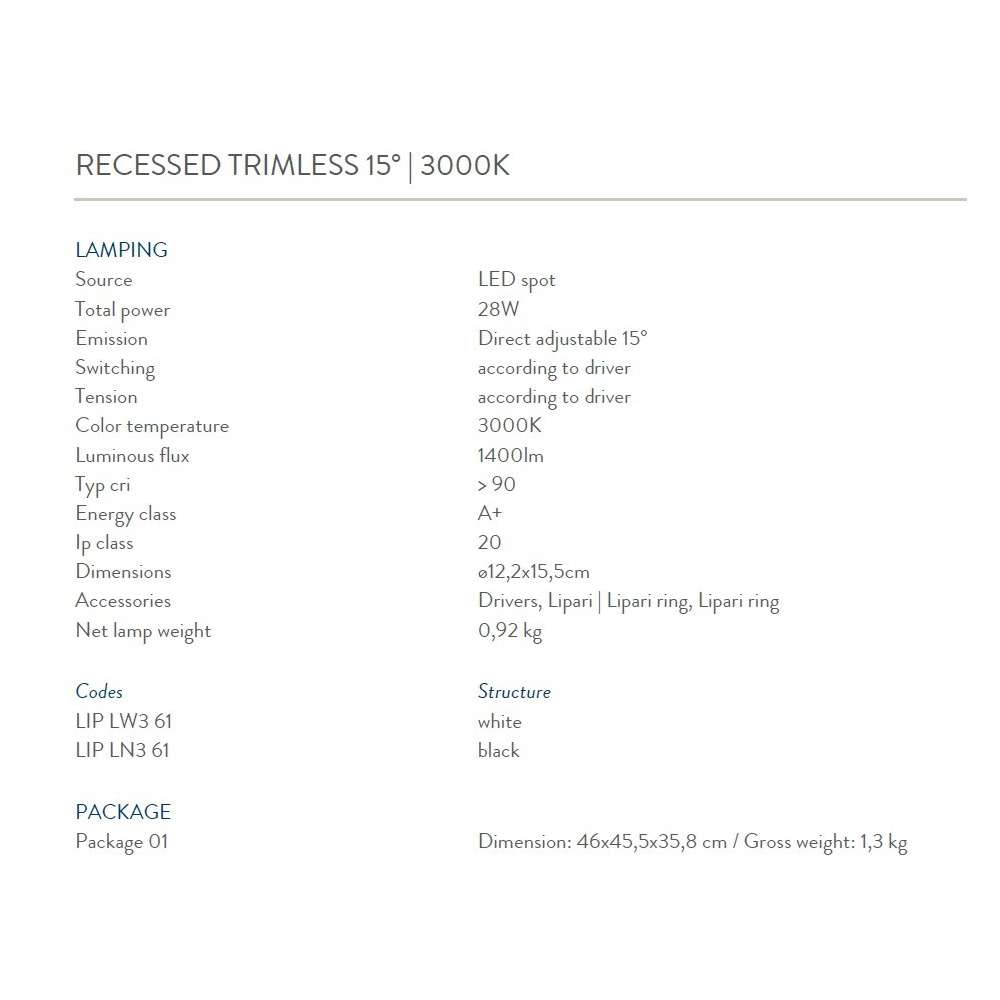Rodzina wbudowanych opraw typu downlight do oświetlenia akcentującego. Oprawa/oprawa jest obracana o 90° w pionie i 35° w poziomie, aby umożliwić swobodną orientację światła w dowolnym kierunku. Modułowa konstrukcja dzieli lampę na kilka niezależnych części. Zewnętrzne pierścienie o różnych wykończeniach są proste w montażu i można je łatwo wymienić, aby spełnić różne wymagania dotyczące otwierania i efektów wizualnych. Dostępnych jest wiele akcesoriów optycznych, aby uzyskać różne efekty świetlne. LED Spot - Ip20 WERSJE WPUSZCZANE TRIMLESS 15 ° / 35 ° | 2700K / 3000K PROFIL WPUSZCZANY 15 ° / 35 ° | 2700K / 3000KOdbiorca: :