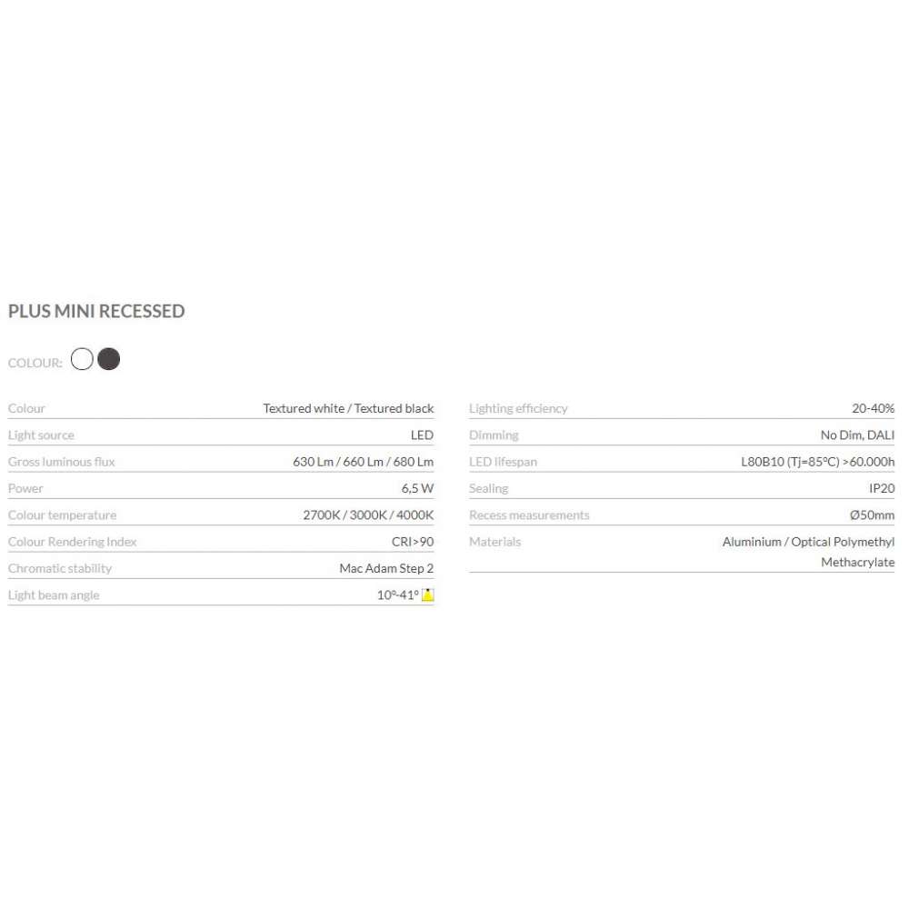 Plus Recessed to reflektor, który oferuje możliwość rozszerzenia lub skupienia wiązki światła za pomocą płynnego ręcznego gestu. Ta cecha sprawia, że Plus jest idealną alternatywą do zastosowań, w których precyzja w obrębie wiązki światła ma kluczowe znaczenie – na przykład: muzea, ekspozycje, sklepy lub oświetlenie akcentujące.