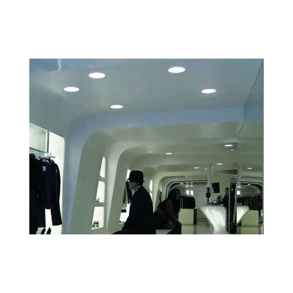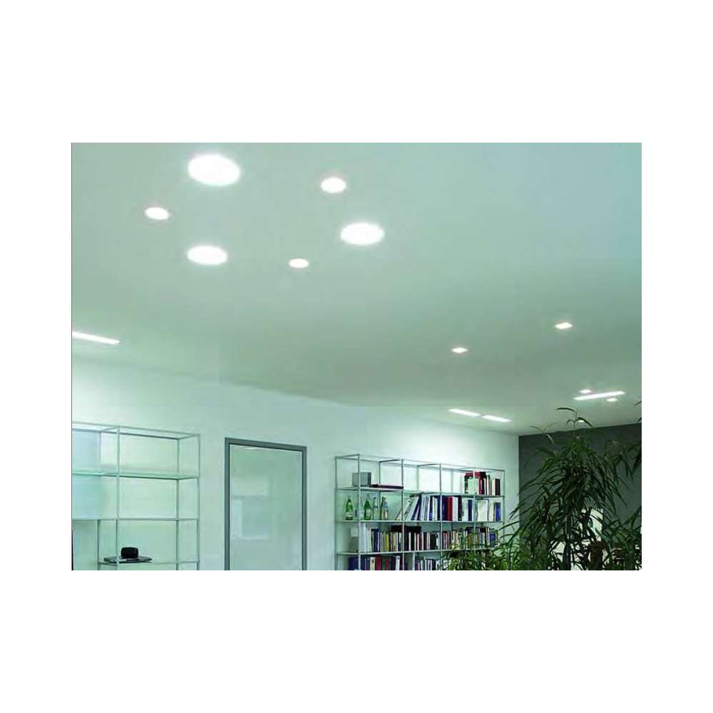 Elios - Montaż podtynkowy. Możliwość montażu na sufitach z płyt gipsowo-kartonowych. Przód z Coral®. Dodatkowy dyfuzor z białego matowego szkła. Szkło jest cofnięte o 3 cm w stosunku do sufitu. Wymiary korpusu: Ø 260 mm, h 200/160 mm. Otwór do płyt gipsowo-kartonowych: Ø 270 mm. Otwór do emisji światła: Ø 200 mm. Dostępne w okablowaniu: halogen QR 111 (+/- 30°), wyładowanie CDM-R 111 (+/- 30°), wyładowanie HIT-DE (90°), halogen QT-DE 12 (90°), świetlówka TC-D i TC-TEL (90°). Elektroniczne urządzenie sterujące, również ściemnialne i indukcyjne.