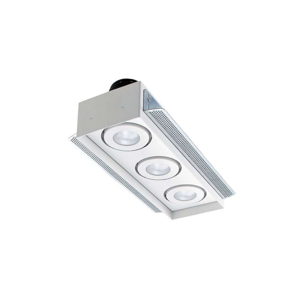 Oprawa do wbudowania do zastosowań wewnętrznych; wpuszczany (sufit); korpus ze stopu aluminium anodowanego EN AW 6082, wykończenie z blachy; wykończenie: biały; 3 (1+1+1) wielochipowe diody LED mocy; 40W - 230Vac; zasilacz: dołączony i okablowany; zawiera kabel 0,30 m; całkowite dostarczone lumeny: 950 lm (3000 K) na emisję; regulowana optyka ±15°: 20°, 40°; kolor LED: biały - 2700K, 3000K, 4000K; stopień ochrony: IP40, IP43 zainstalowany; temperatura pracy: 0°C +45°C; temperatura ekranu: max 40°C (Ta 25°C); bezpieczeństwo fotobiologiczne: grupa ryzyka 1 zgodnie z EN62471:2006; klasa urządzenia: II; waga 1,50 kg; wymiary 275x95x101 mm; rozmiar wycięcia 95x275 mm; całkowita objętość 190x370x150 mm; ściemnianie za pomocą DALI, 1-10V, PUSH; akcesoria: obudowa zewnętrzna WC2403