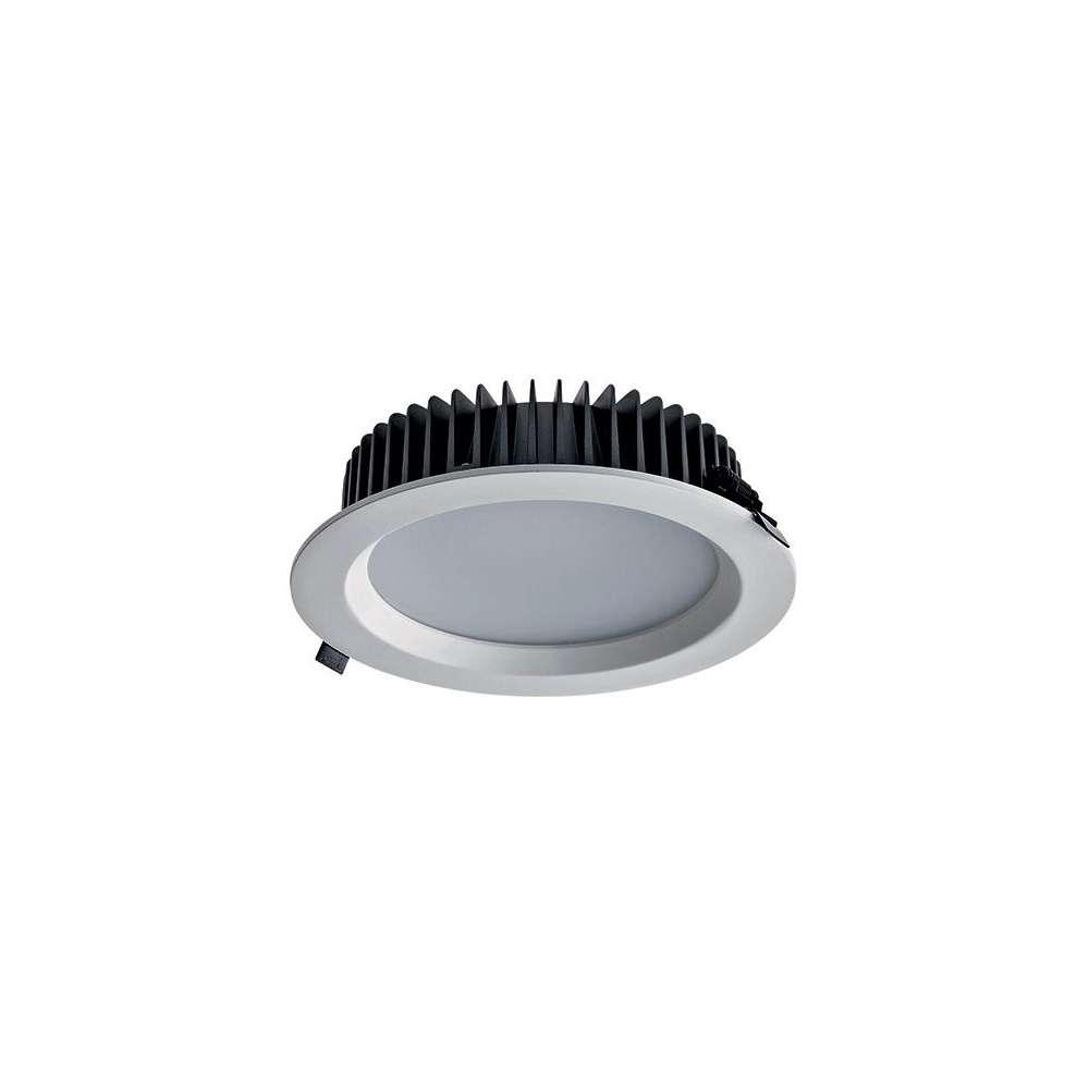 Downlight do wbudowania do zastosowań wewnętrznych; wpuszczany (sufit); korpus i osłona z odlewanego ciśnieniowo stopu aluminium EN AB 47100, osłona z poliwęglanu matowego z jednej strony; wykończenie: biały; matryca LED mocy; 36W - 230Vac; zasilacz: dołączony i okablowany; zawiera kabel 0,30 m; suma dostarczonych lumenów: 2418 lm (3000K); optyka rozproszona; kolor LED: biały - 3000K, 4000K; stopień ochrony: IP40, IP44 zainstalowany; temperatura pracy: 0°C +45°C; temperatura ekranu: max 40°C (Ta 25°C); bezpieczeństwo fotobiologiczne: grupa ryzyka 1 zgodnie z EN62471:2006; klasa urządzenia: II; waga 1,15 kg; wymiary Ø197x53 mm; rozmiar wycięcia Ø180 mm; całkowita objętość Ø280x120 mm