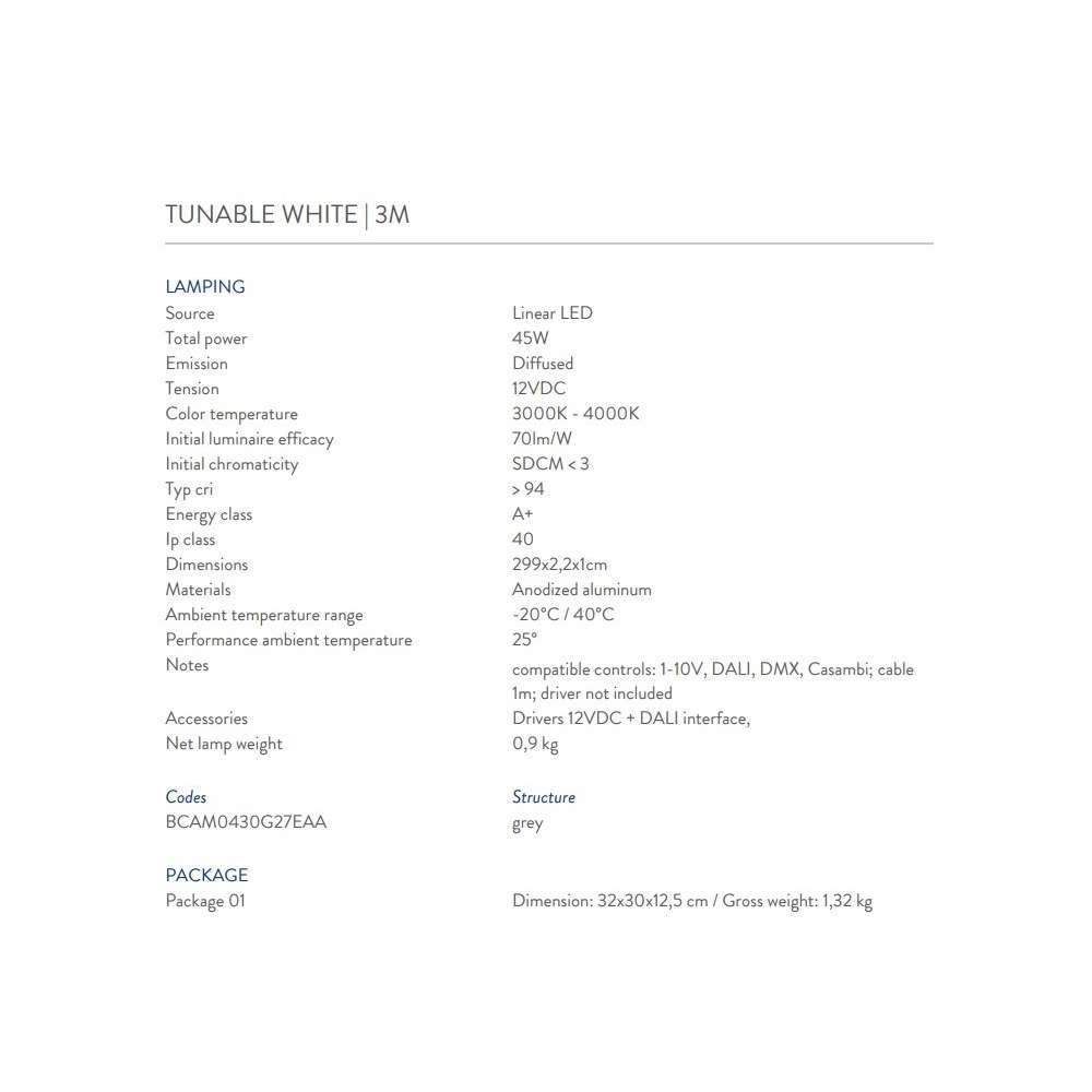 System Camaled to modułowy, przestrajalny biały system LED do zastosowań wewnętrznych. Obudowa z naturalnego lub czarnego anodowanego aluminium, dostępna w różnych długościach. Modułowa dioda LED o wysokiej emisji o zmiennej temperaturze barwowej od 3000K do 4000K, obrotowa i ściemnialna. System Camaled jest dostępny z piaskowanym lub przezroczystym ekranem. Możliwość ściemniania 1…10 V lub z konsolą DMX. TUNABLE BIAŁY | 1M Całkowita moc 15W | Napięcie 12VDC | Temperatura barwowa 3000K - 4000K | Strumień świetlny 680lm | Początkowa skuteczność oprawy > 45lm/W | Początkowa chromatyczność SD cm 94 | Klasa energetyczna A+ | Klasa IP 40 TUNABLE BIAŁY | 2M Całkowita moc 30W | Emisja rozproszona | Napięcie 12VDC | Temperatura barwowa 3000K - 4000K | Początkowa skuteczność oprawy > 45lm/W | Początkowa chromatyczność SD cm 94 | Klasa energetyczna A+ | Klasa IP 40 TUNABLE BIAŁY | 3M Całkowita moc 45W | Temperatura barwowa 3000K - 4000K | Początkowa skuteczność oprawy 70lm/W | Początkowa chromatyczność SD cm 94 | Klasa energetyczna A+ | Klasa Ip 40 AKCESORIA: Sterowniki 12VDC + DALIOdbiorca: :
