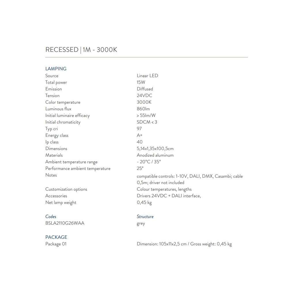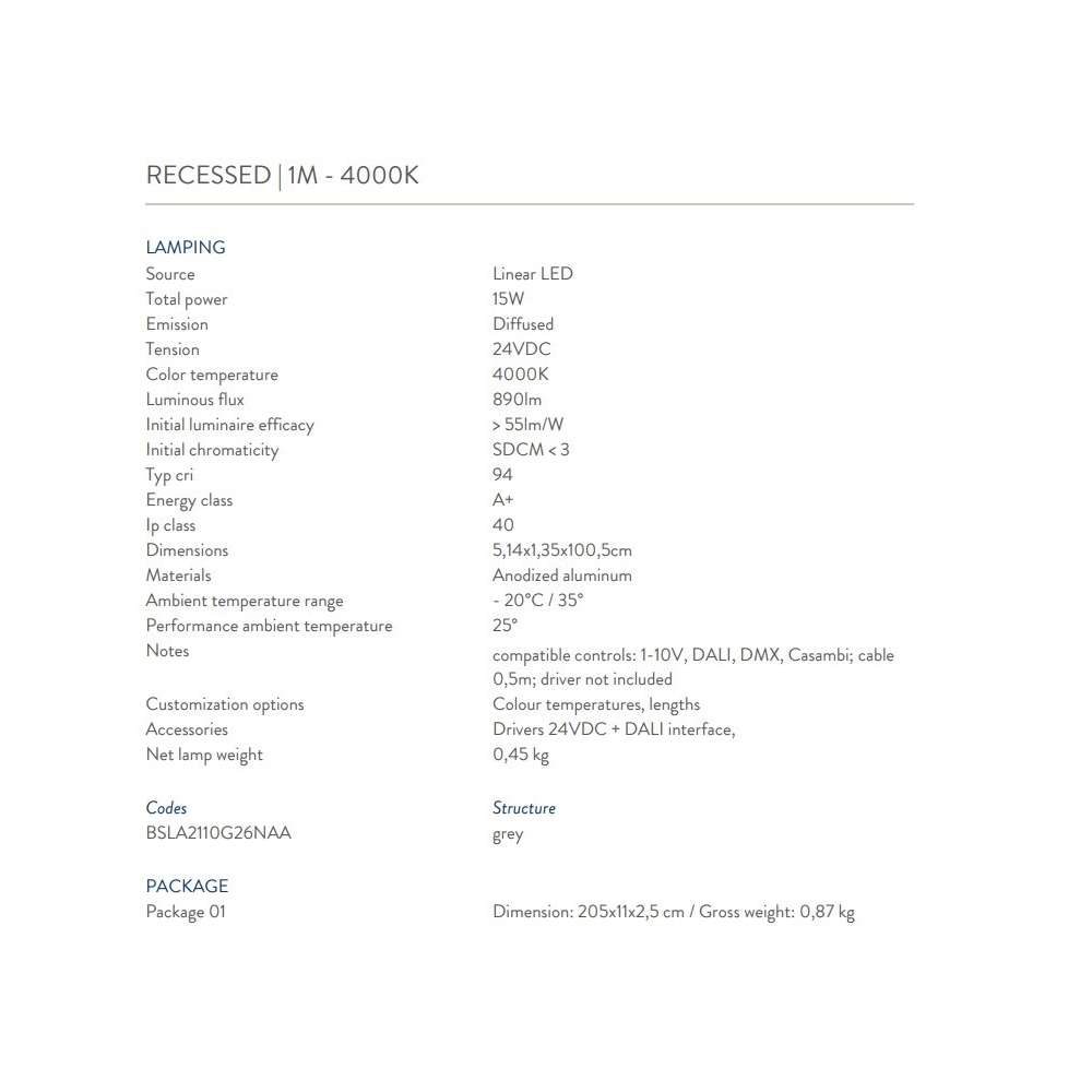 Rodzina SLACKLINE składa się z szerokiej gamy profili aluminiowych z różnymi rodzajami mocowania, ale z tym samym źródłem LED: Slackline Trim, Slackline Regular i Slackline Micro. Te cechy sprawiają, że instalacja Slackline jest bardzo elastyczna w każdym otoczeniu. Minimalna konstrukcja i doskonała jakość światła. Slackline nadaje się również do rozwiązań połączeń liniowych (na życzenie). W zależności od rodzaju mocowania, Slackline jest dostępny różne długości standardowe z CRI>94. Linearne źródło LED Ip40 Instalacja: wpuszczana, podwieszana, sufitowa, ścienna WERSJE - 1m - 3000K: Całkowita moc 15W | Strumień świetlny 860lm | Napięcie 24VDC | Typ cri 97 | Klasa energetyczna A+ - 1m - 4000K: Całkowita moc 15W | Strumień świetlny 860lm | Napięcie 24VDC | Typ cri 97 | Klasa energetyczna A+ - 2m - 3000K: Całkowita moc 30W | Strumień świetlny 1720lm | Napięcie 24VDC | Typ cri 97 | Klasa energetyczna A+ - 2m - 4000K: Całkowita moc 30W | Strumień świetlny 1720lm | Napięcie 24VDC | Typ cri 97 | Klasa energetyczna A+Odbiorca: :