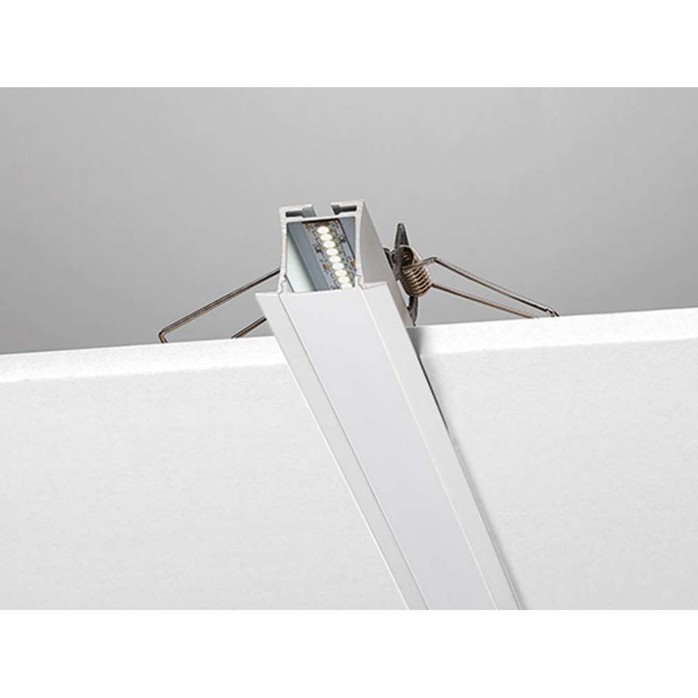 Profil aluminiowy wpuszczany biały do taśmy LED z kloszem przezroczystym, opalizowanym lub trawionym kwasem o długości 2m. W komplecie zaślepki. Otwarte otwory w profilu aluminiowym do montażu. Ze sprężynami stalowymi.