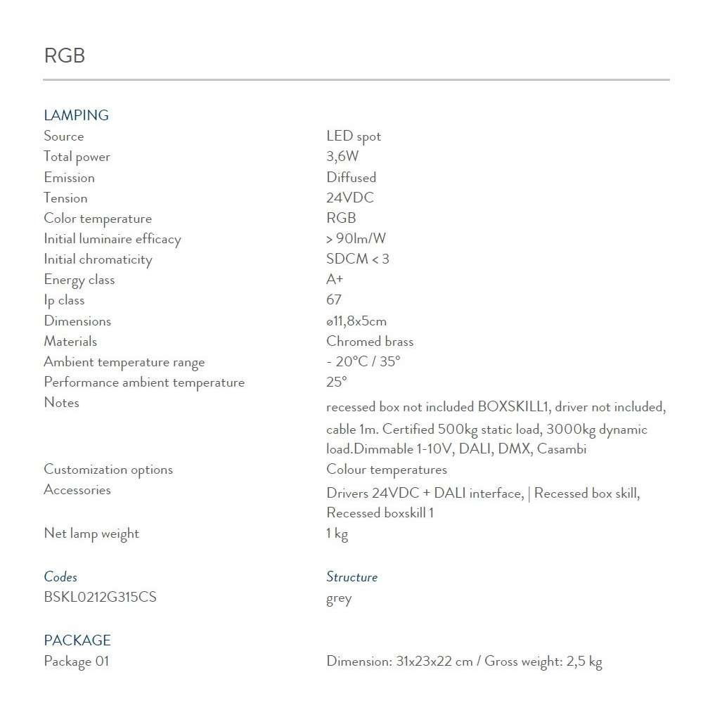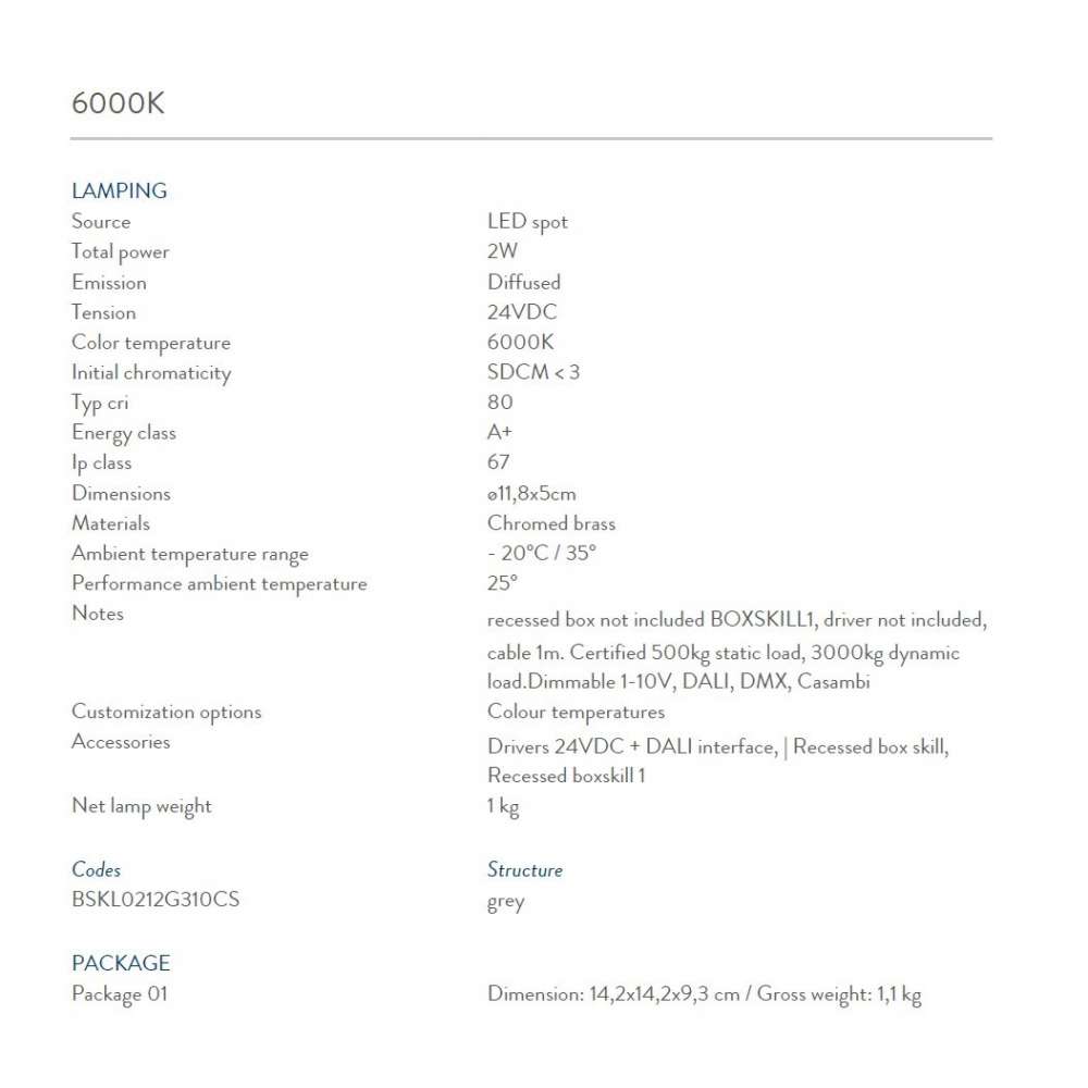 Wbudowany spot LED do użytku na zewnątrz. Odporność na ciężar do 3000kg. Obudowa z aluminium, chromowany mosiądz i poliwęglan. Efekt białego światła lub RGB stworzony przez przezroczysty dysk poliwęglanowy (niebieski/zielony/bursztynowy/czerwony na życzenie). 1 wysokowydajna dioda LED. IP67, w pełni zabezpieczona przed wnikaniem kurzu i wody. Mocowanie poprzez aluminiową skrzynkę BOXSKILL1 (brak w zestawie). WERSJE - LED 6000K miejsce | Całkowita moc 2W | Napięcie 24VDC | Typ cri 80 | Klasa energetyczna A+ | Ip67 - Spot LED RGB | Całkowita moc 3,6W | Napięcie 24VDC | Typ cri 80 | Klasa energetyczna A+ | IP67Odbiorca: :